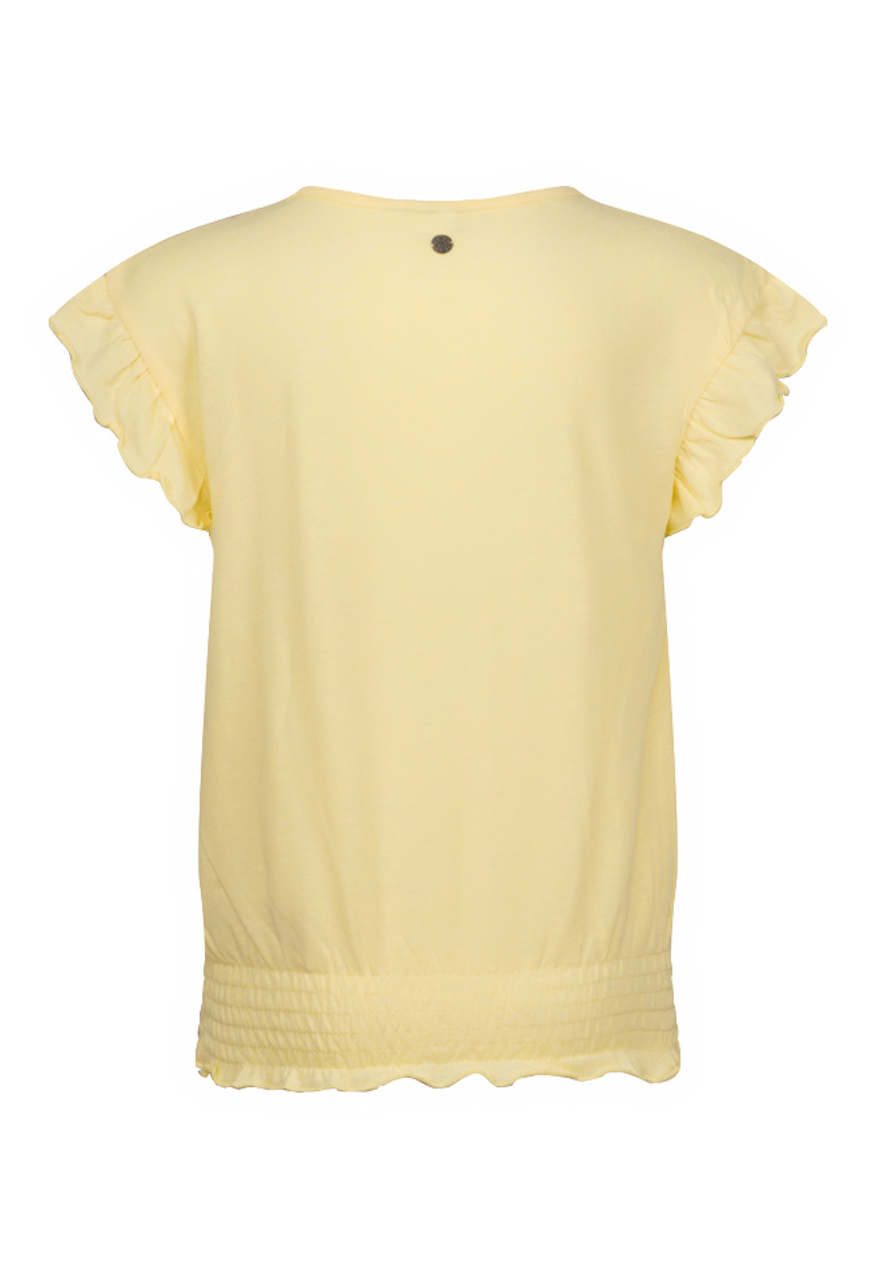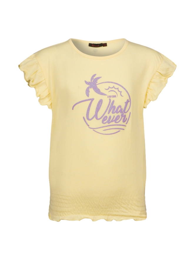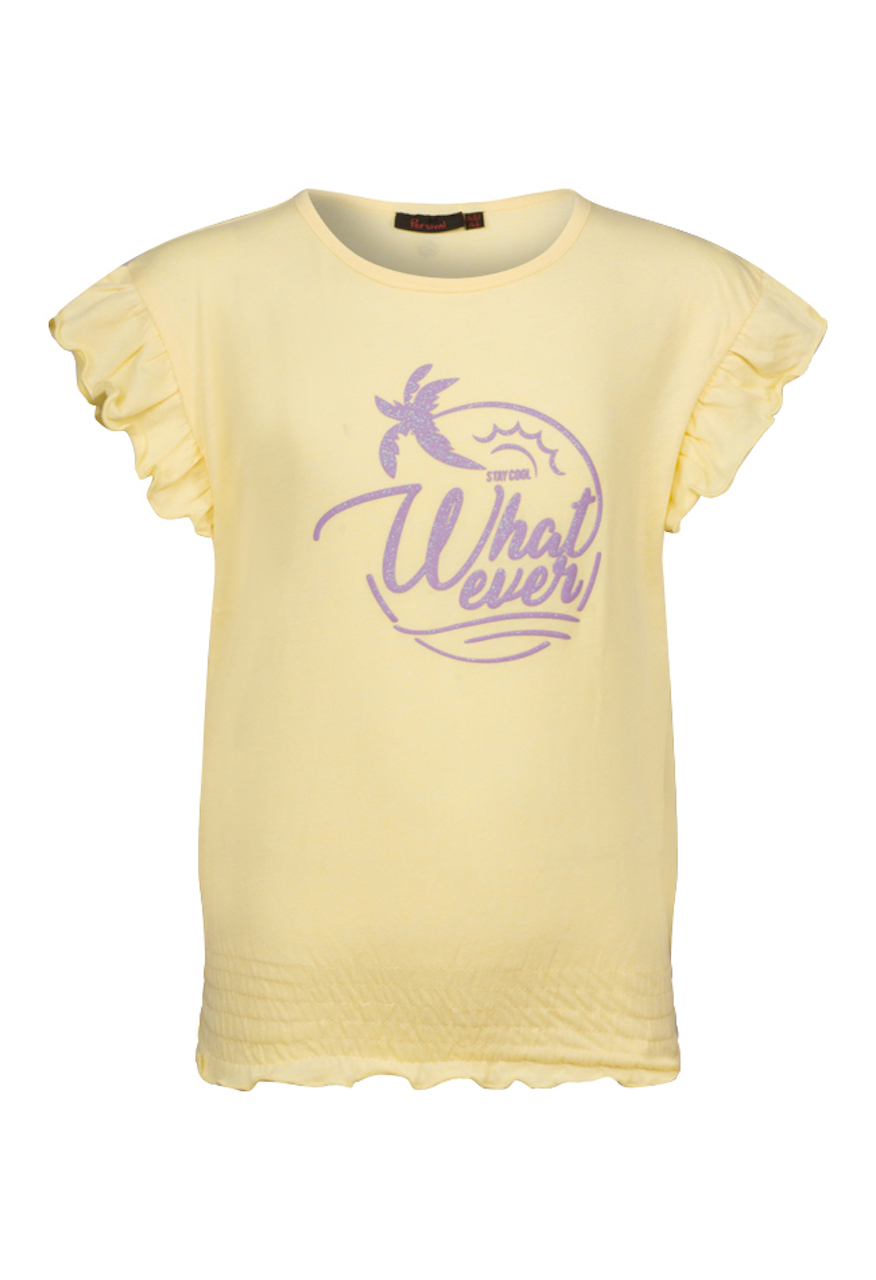 T-shirt met ruffel mouwen van Persival. Dit zomerse t-shirt is verkrijgbaar in drie pastel kleuren. Op de voorkant zit een geplaatste puffprint met de tekst: What ever. Het t-shirt heeft een ronde hals, de onderkant word aangesloten met een elastieken smockband.