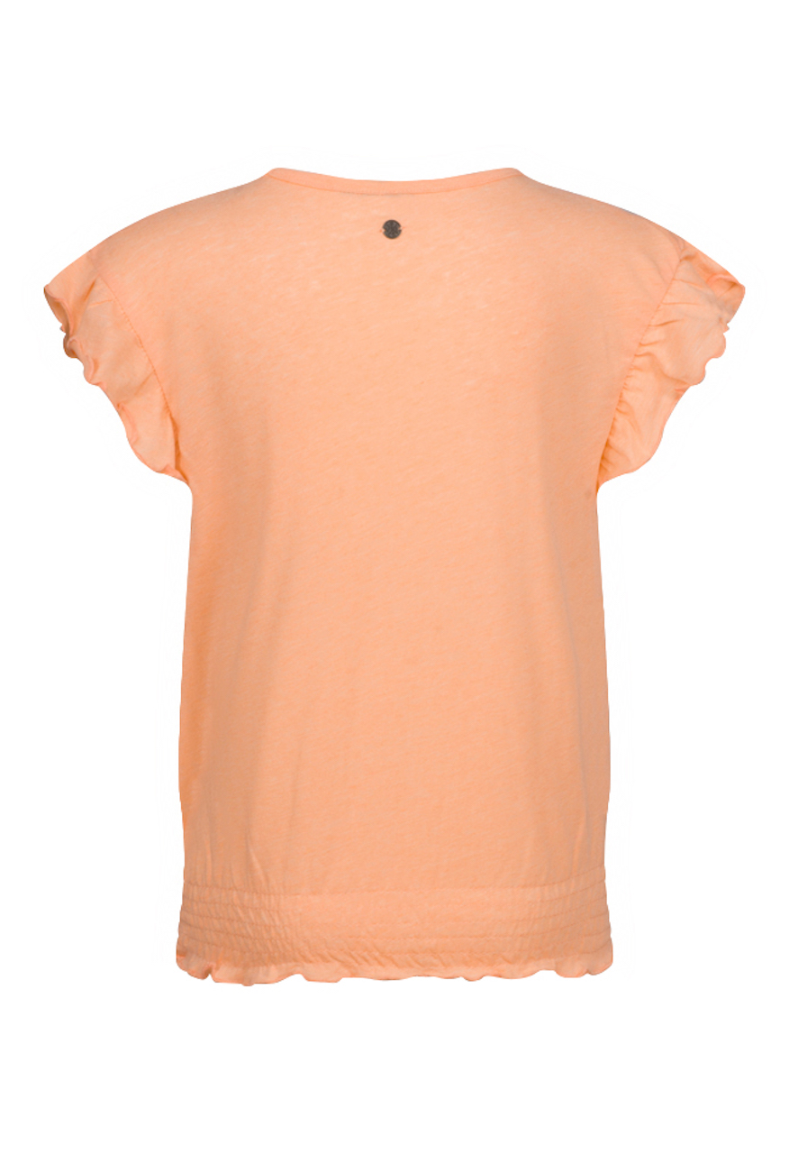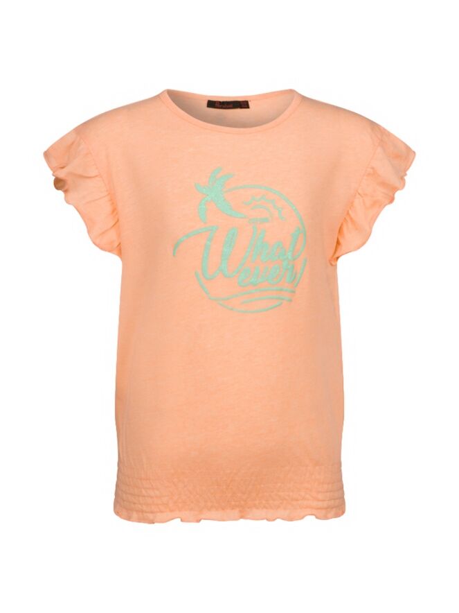 T-shirt met ruffel mouwen van Persival. Dit zomerse t-shirt is verkrijgbaar in drie pastel kleuren. Op de voorkant zit een geplaatste puffprint met de tekst: What ever. Het t-shirt heeft een ronde hals, de onderkant word aangesloten met een elastieken smockband.