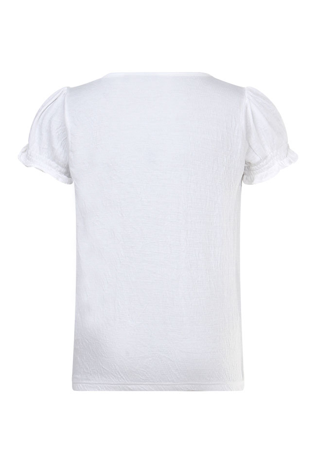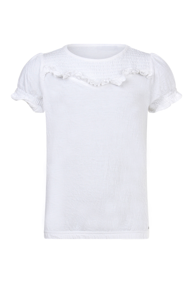 T-shirt met een ronde hals en korte pofmouwen met een elastische boord. Aan de voorkant van het t-shirt zit een smock detail met een ruche. De onderkant heeft een elastische boord. Het t-shirt is verkrijgbaar in vier verschillende kleuren.