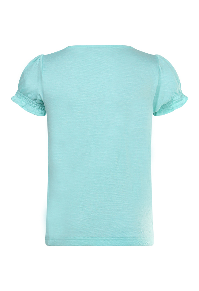 T-shirt met een ronde hals en korte pofmouwen met een elastische boord. Aan de voorkant van het t-shirt zit een smock detail met een ruche. De onderkant heeft een elastische boord. Het t-shirt is verkrijgbaar in vier verschillende kleuren.