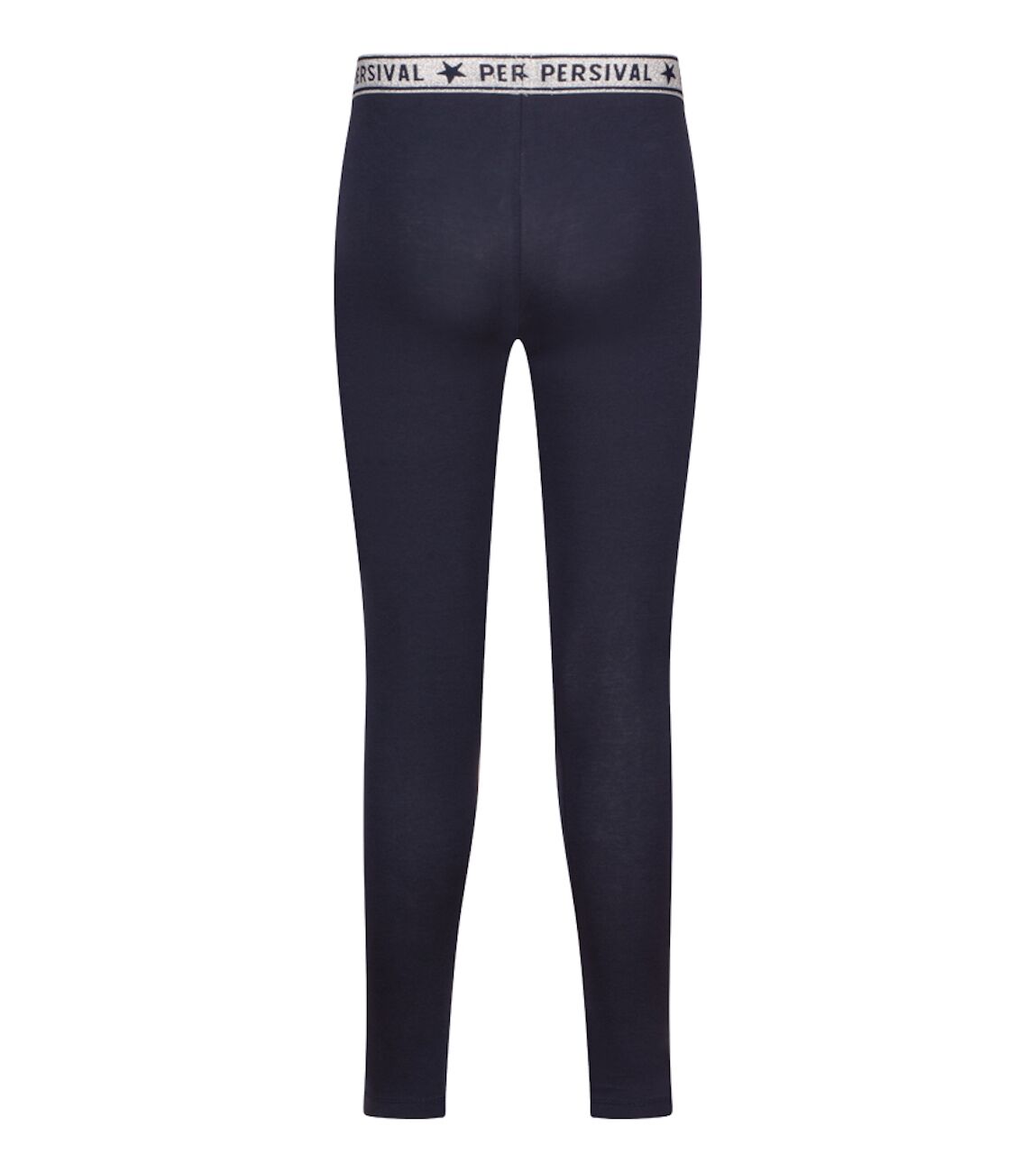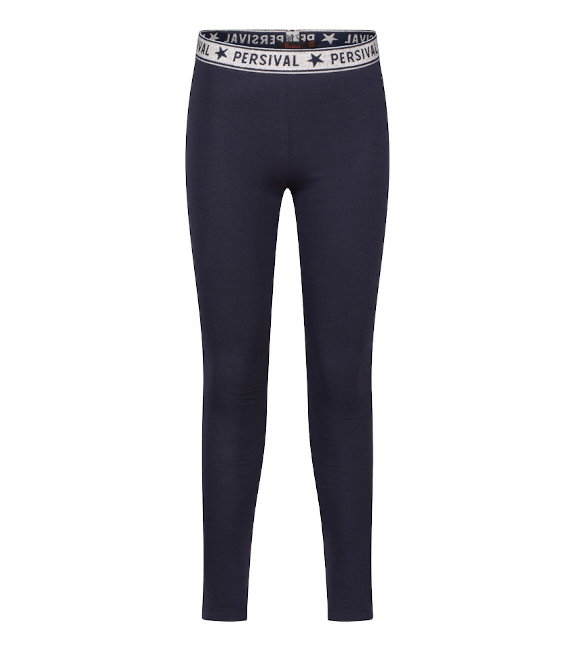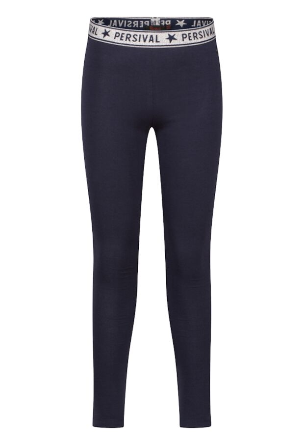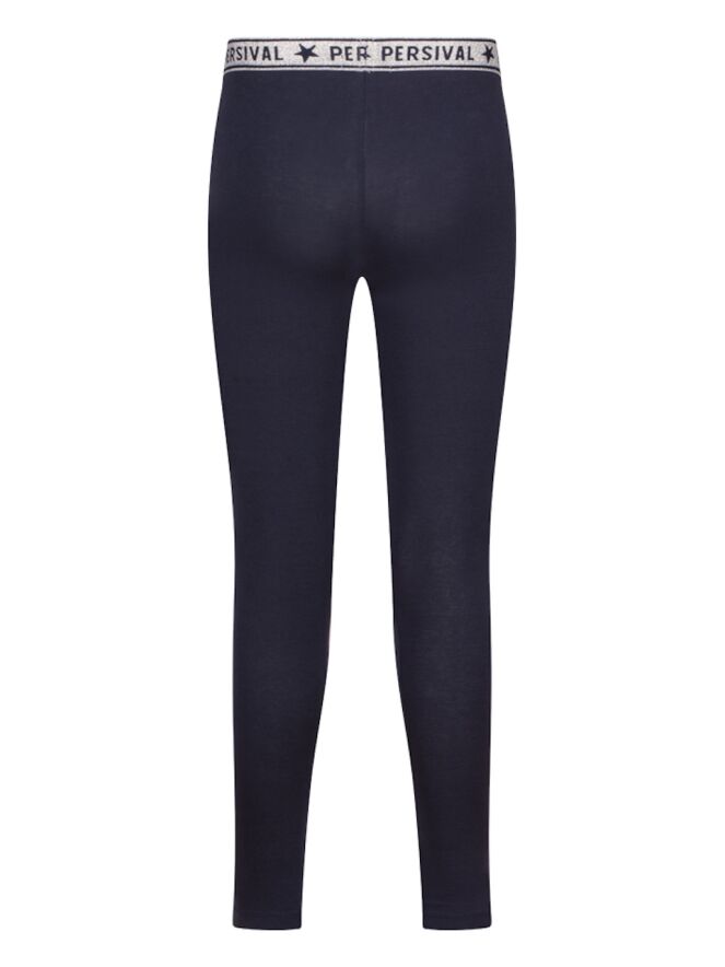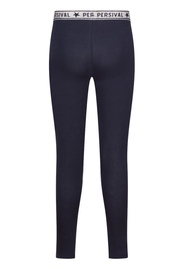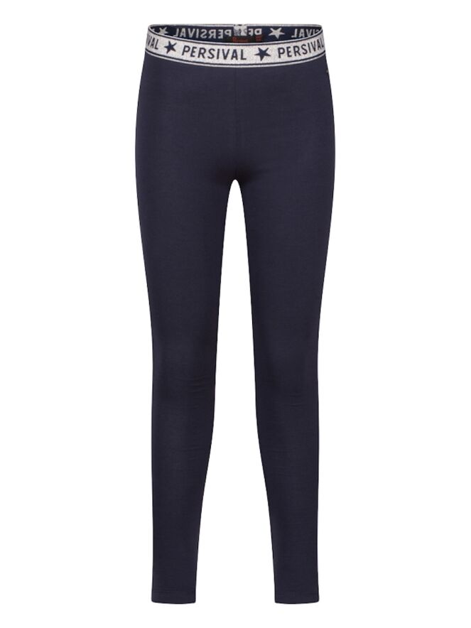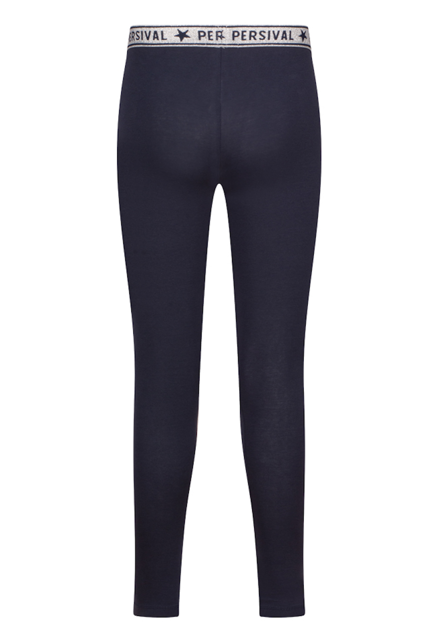 Legging van Persival. Deze legging heeft een lange lengte. De taille heeft elastieken glitter band. Hij is verkrijgbaar in twee basis kleuren; zwart en marine. Ideaal om te combineren met een rokje, jurkje of korte broek.