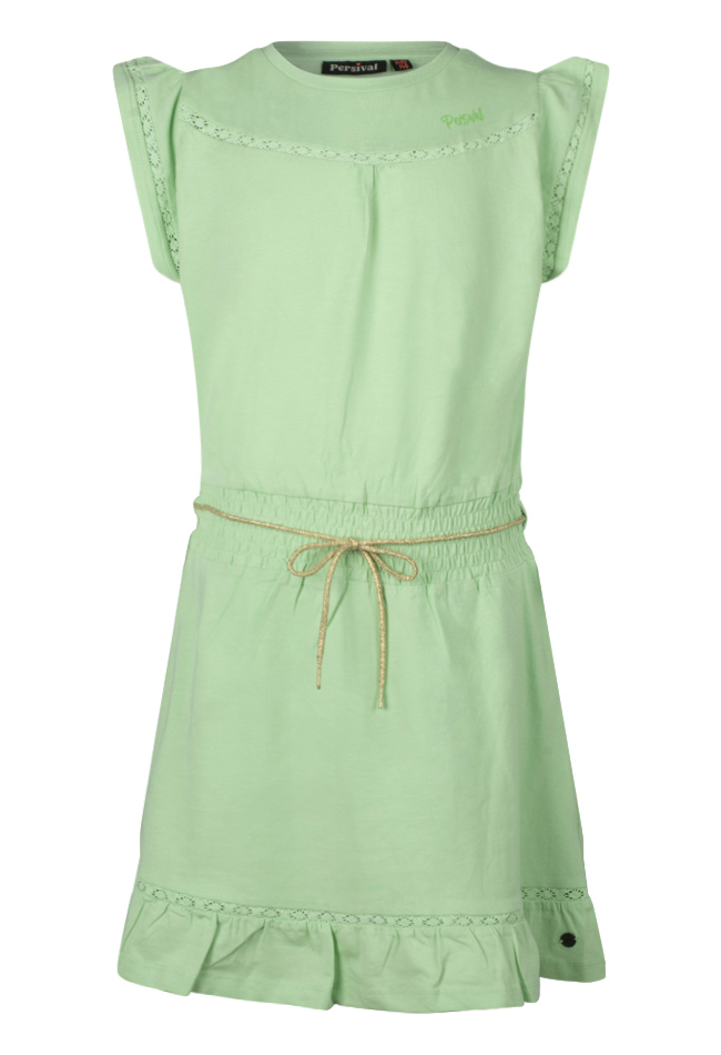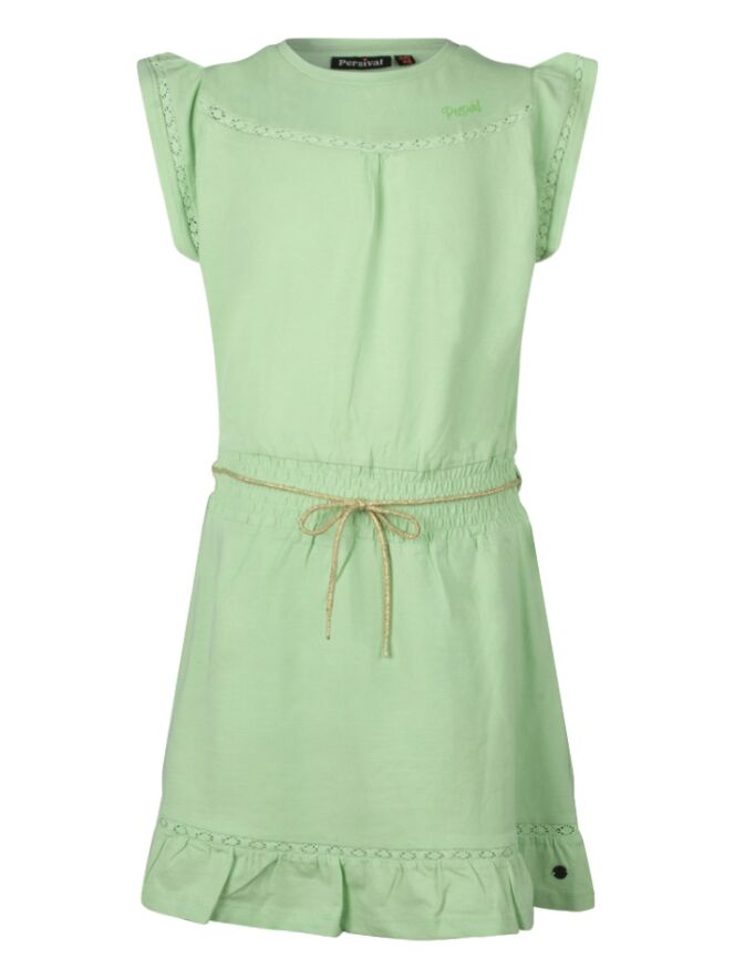 Dit jurkje heeft een brede elastische smockband in de taille en een sierlijke bies in de mouw, onderaan in het rokje en voorlangs.