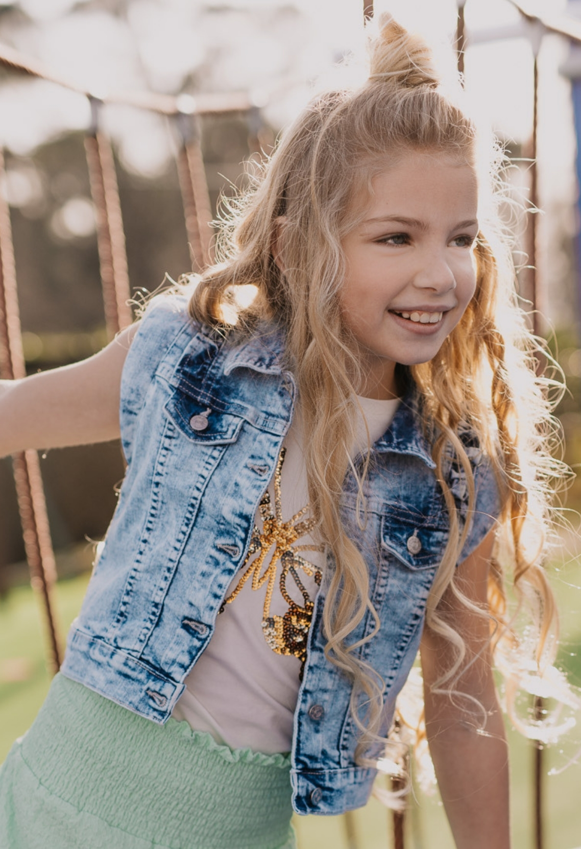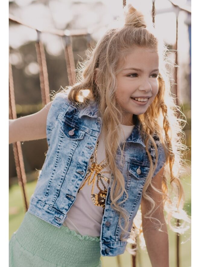Dit leuke denim giletje voor baby meisjes heeft een ruche over de schouder.