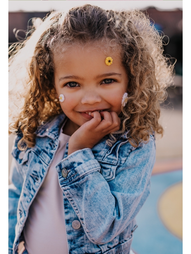 Dit leuke spijkerjasje voor meisjes heeft leuke details zoals ruches over de schouders, elastiek in de taille en een bleached look. De maatserie is ook verkrijgbaar voor baby meisjes met artikelnummer Z80127 van Bakkaboe.