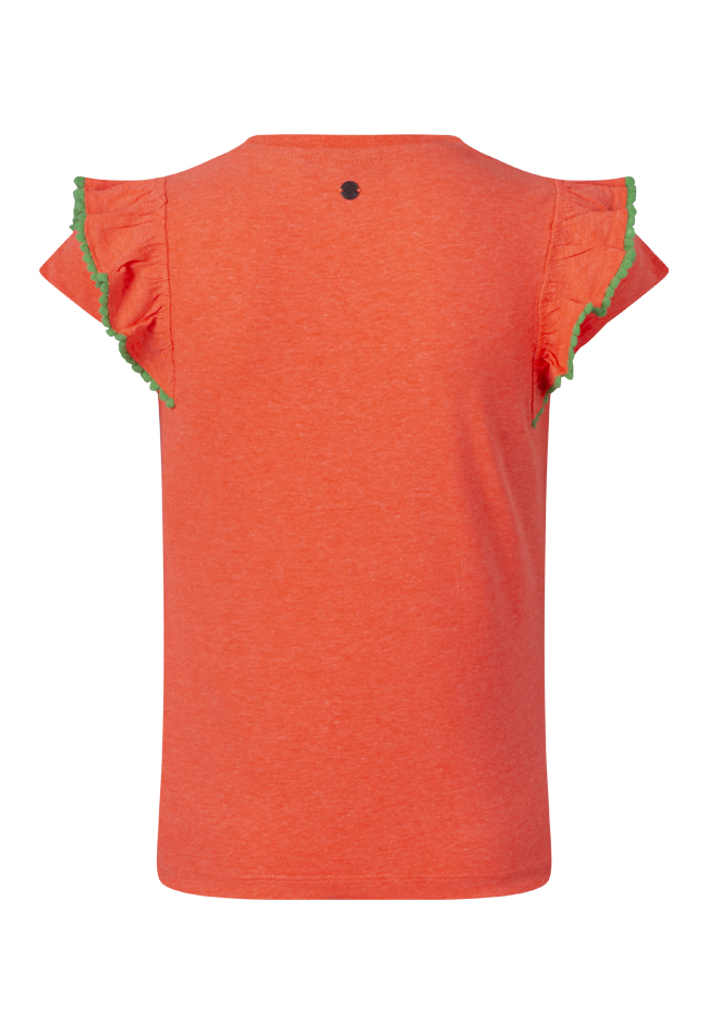 Dit shirt heeft ruches over de schouder welke afgezet zijn met bolletjes.