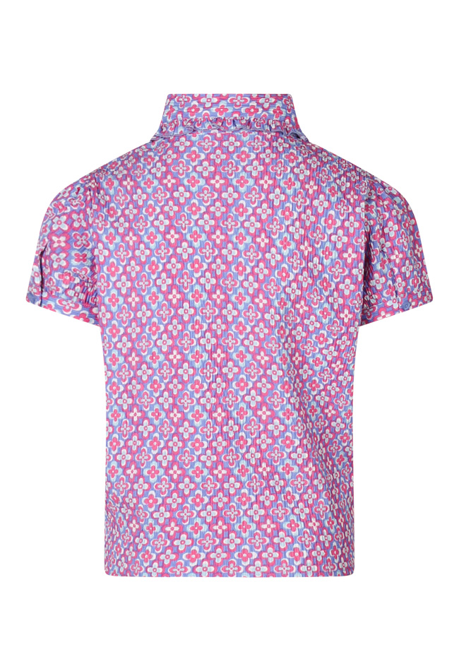 Dit vrolijke gebloemde knoop blousje heeft korte mouwen een een extra ruche op het kraagje. Er is een bijpassende broek verkrijgbaar onder art.nr. Z80102