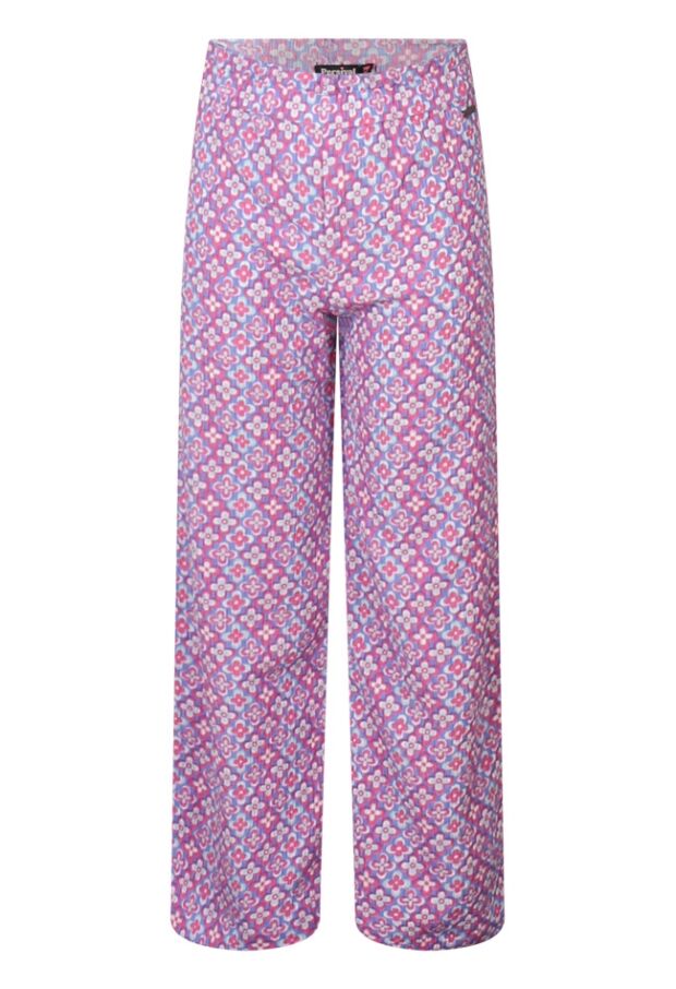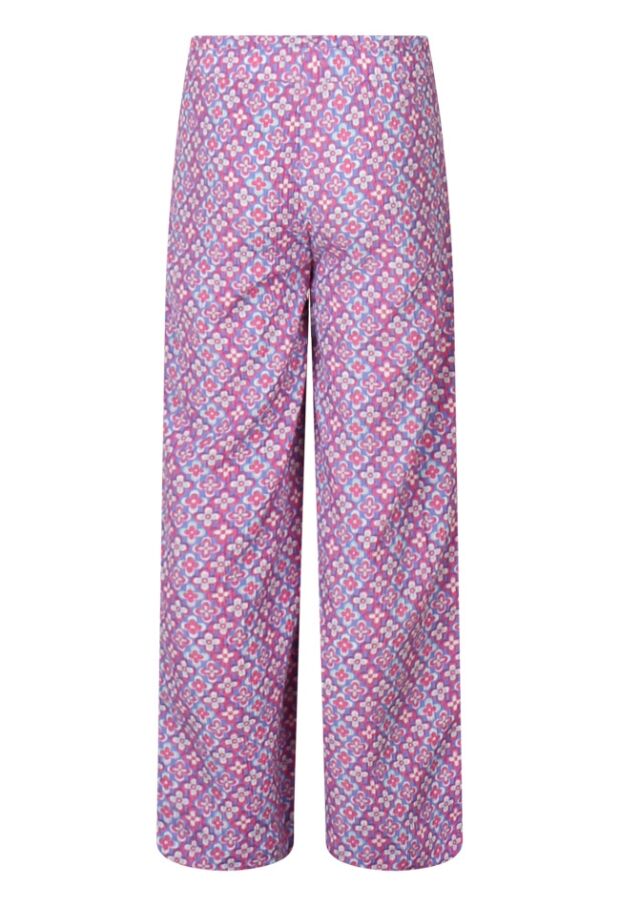 Deze vrolijke gebloemde broek van crincle stof heeft wijde pijpen. Er is een bijpassende knooptop verkrijgbaar onder art.nr. Z80100
