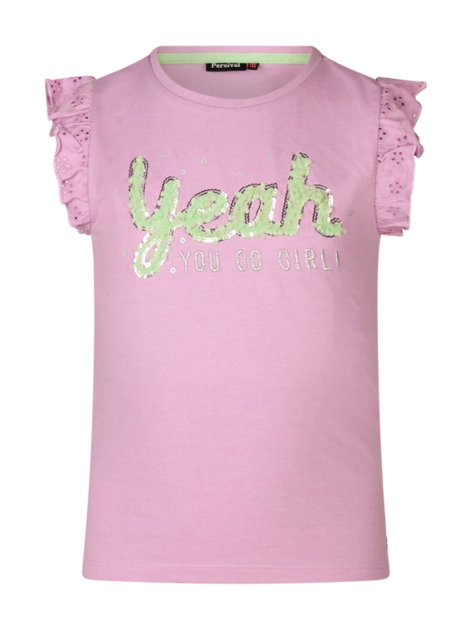 Dit T-shirtje heeft een broderie mouwtje met een leuke print op de voorkant.