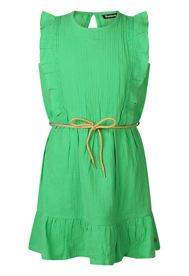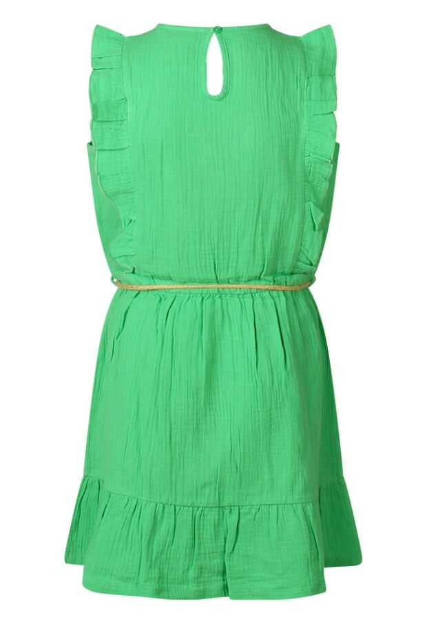 Dit jurkje van katoenen wafeldoek heeft ruches en een koordje in de middel. Op de achterkant ter hoogte van de hals zit een druppeluitsparing.