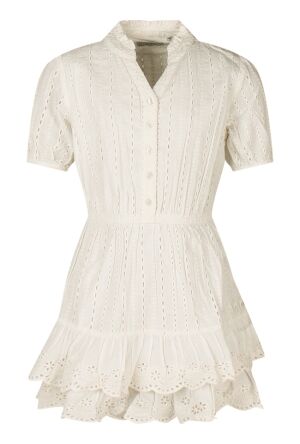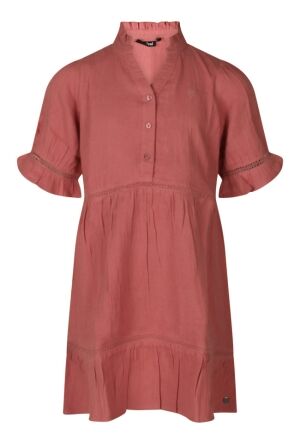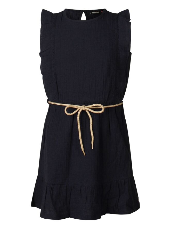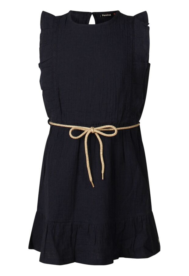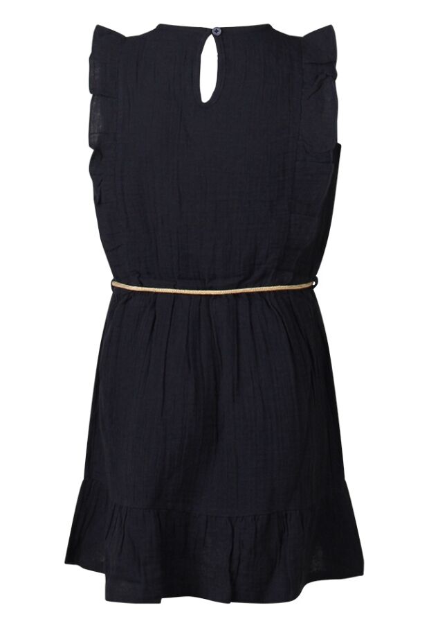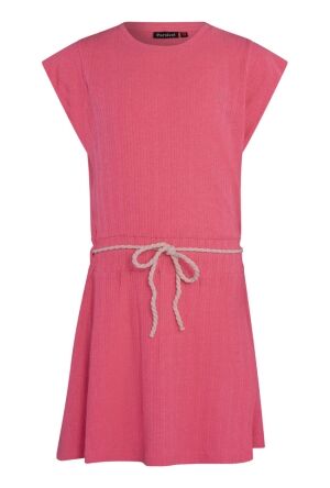 Dit jurkje van katoenen wafeldoek heeft ruches en een koordje in de middel. Op de achterkant ter hoogte van de hals zit een druppeluitsparing.