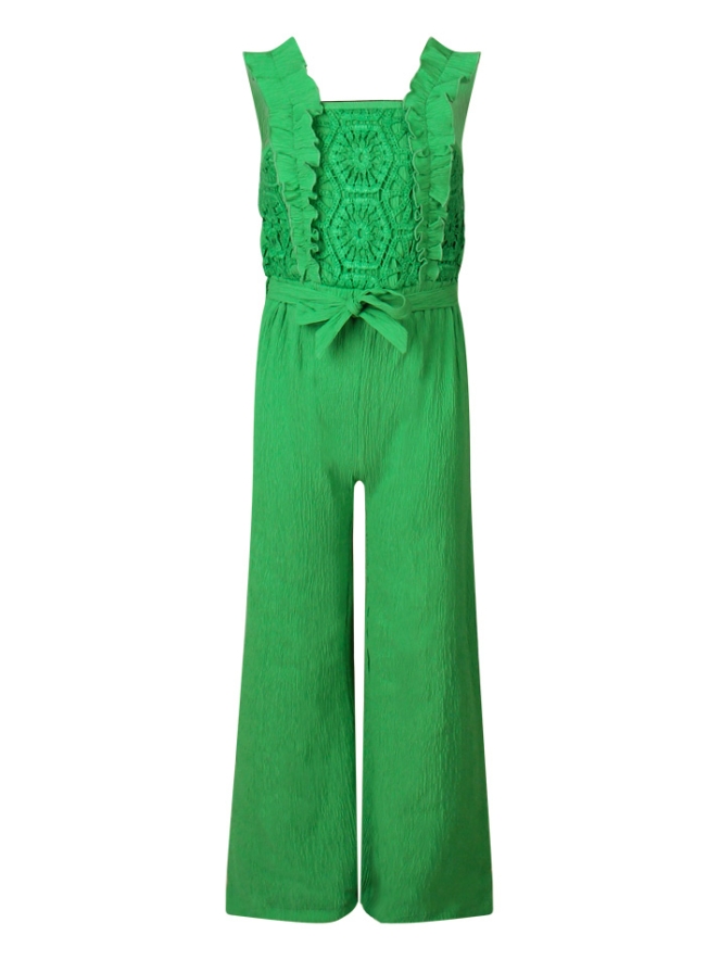Deze jumpsuit met sierlijke boventop heeft ruche schouderbandjes, ceintuurtje in de middel en rechte broekspijpen.