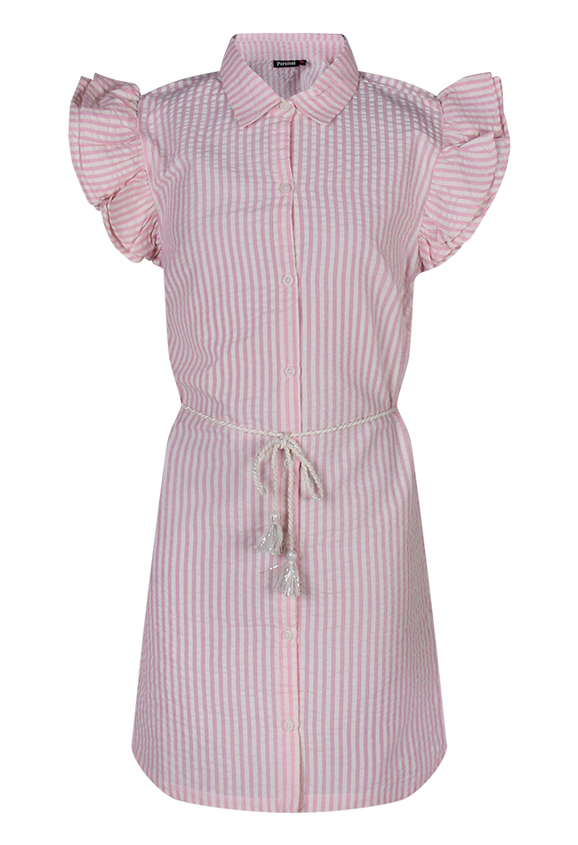 Deze meisjesjurk van Persival heeft een vrolijk streepjespatroon en een klassieke kraag voor een tijdloze uitstraling. De jurk is voorzien van een doorknoopsluiting en heeft schattige ruchemouwen die een speelse touch geven. Het koordje in de taille zorgt ervoor dat de jurk mooi kan worden aangepast voor een perfecte pasvorm.