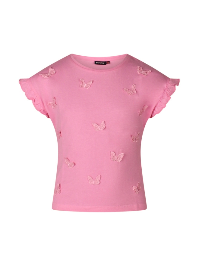 Dit T-shirtje vol met opgestikte vlinders laat jouw meisje stralen in de zomerzon. Mix en match met een rokje, skort of lange of korte broek! Super hip en mega vrolijk worden wij hier van!