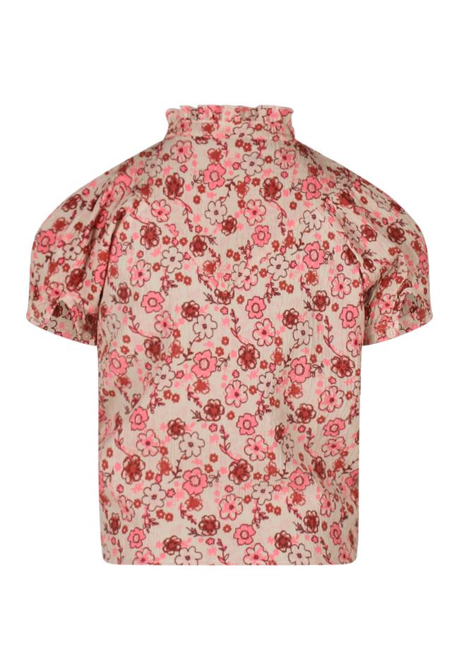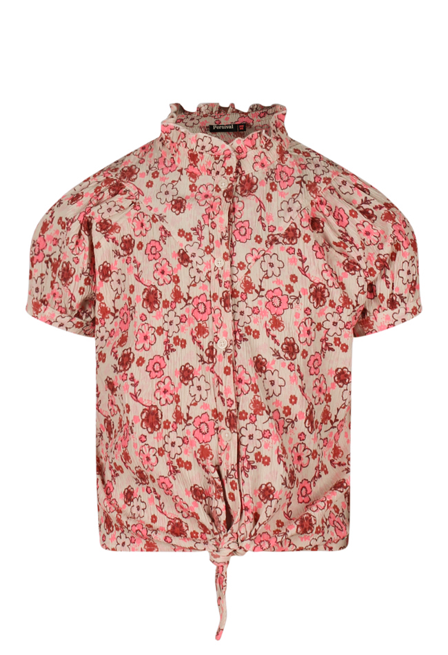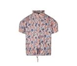Dit vrolijke knoop blousje sluit met knoopjes en heeft een ruche rond de hals. De top gemaakt van crincle stof draagt luchtig en is leuk te combineren met de bijpassende broek Art.nr. Z90047