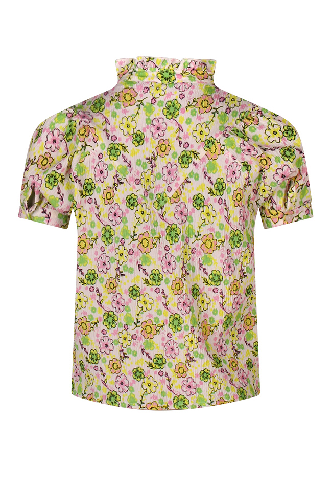 Dit vrolijke knoop blousje sluit met knoopjes en heeft een ruche rond de hals. De top gemaakt van crincle stof draagt luchtig en is leuk te combineren met de bijpassende broek Art.nr. Z90047