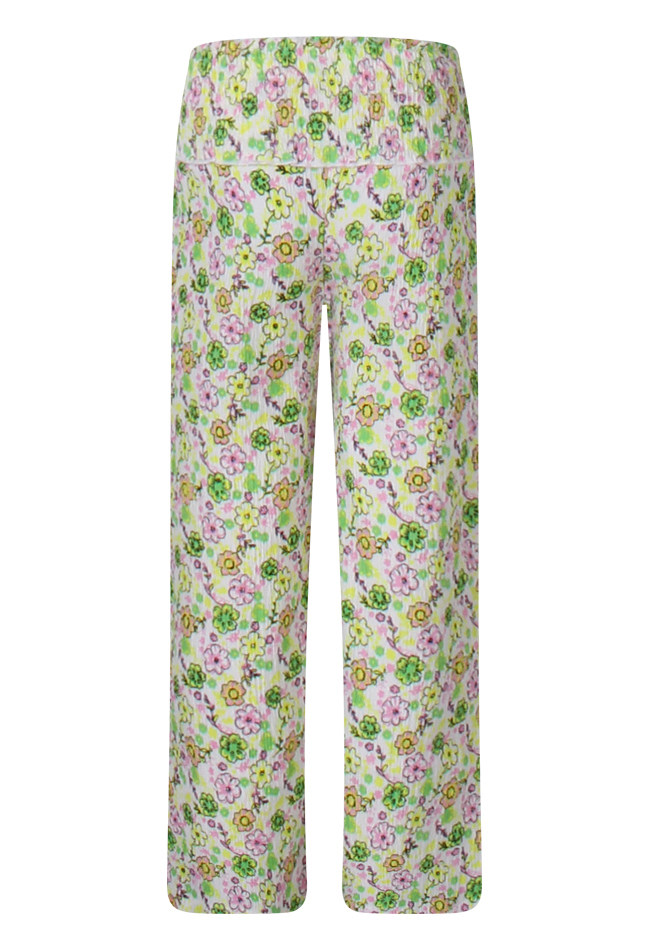 Leuke zomerse luchtige broek van crincle stof met vrolijke bloemenprint! Deze broek heeft geen zakken maar de hoge elastische tailleband maakt dat helemaal goed! Liever een co-ord set? We hebben een bijpassende blouse met korte mouw voor erbij. Art.nr. Z90046