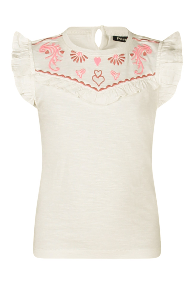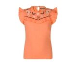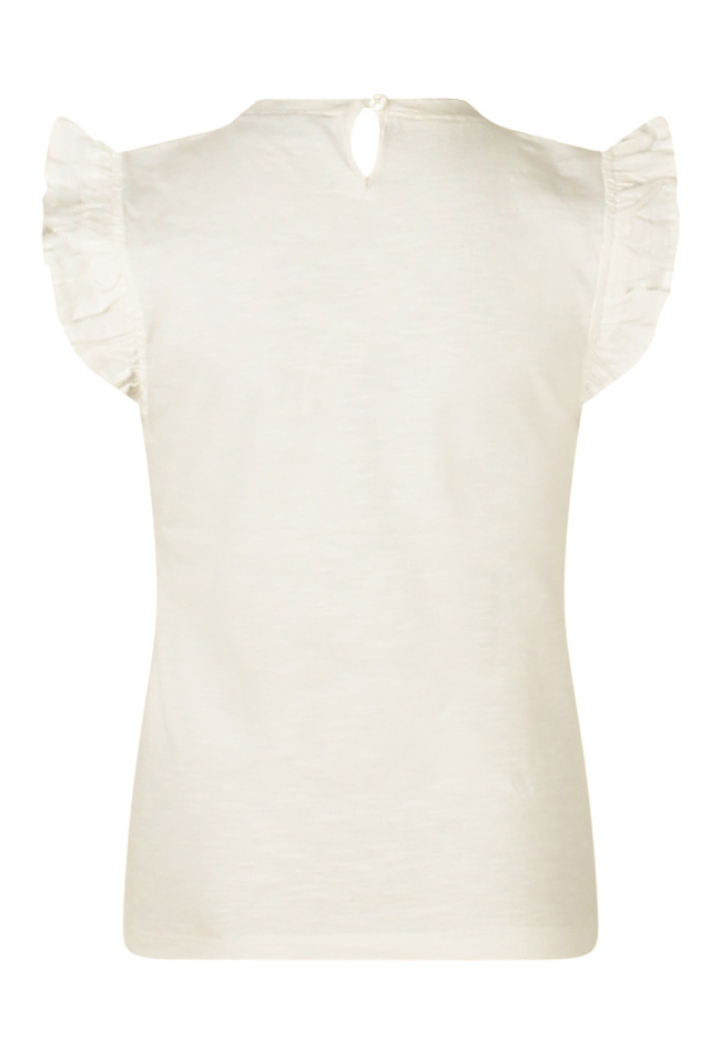 Vrolijk T-shirt met mooi borduursel en leuke ruches. Doet het goed onder een spijkerjasje of gewoon op een korte broek!