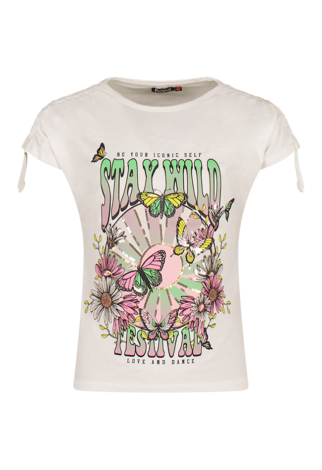 Stay Wild Festival Vibes! Dit vrolijke trendy shirtje laat jou stralen tijdens je favo dansje! Met een leuk optrekkoordje op de schouder en een mooie print voorop met glimmende paillettjes.
