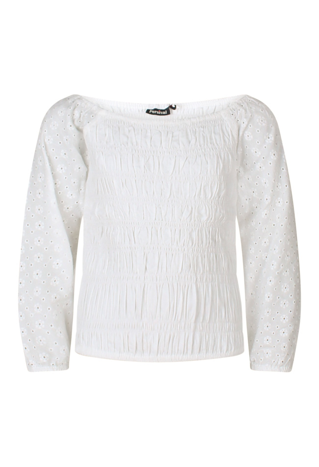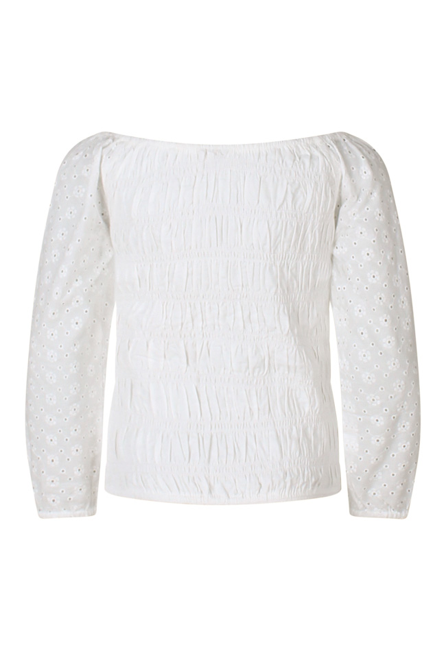 Even echt wat anders! Het lijfje van deze top is van dubbel gesmockt 100% katoen en veert heerlijk mee. De mouwen zijn van broderie en hebben een mooi ingeborduurd patroon. Leuk te combineren op denim!!