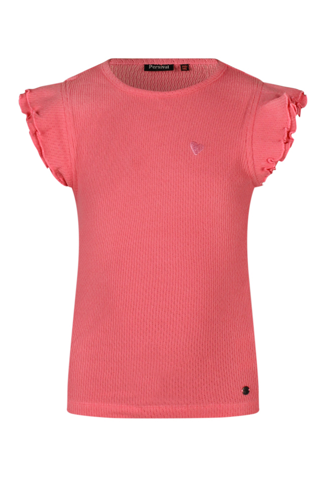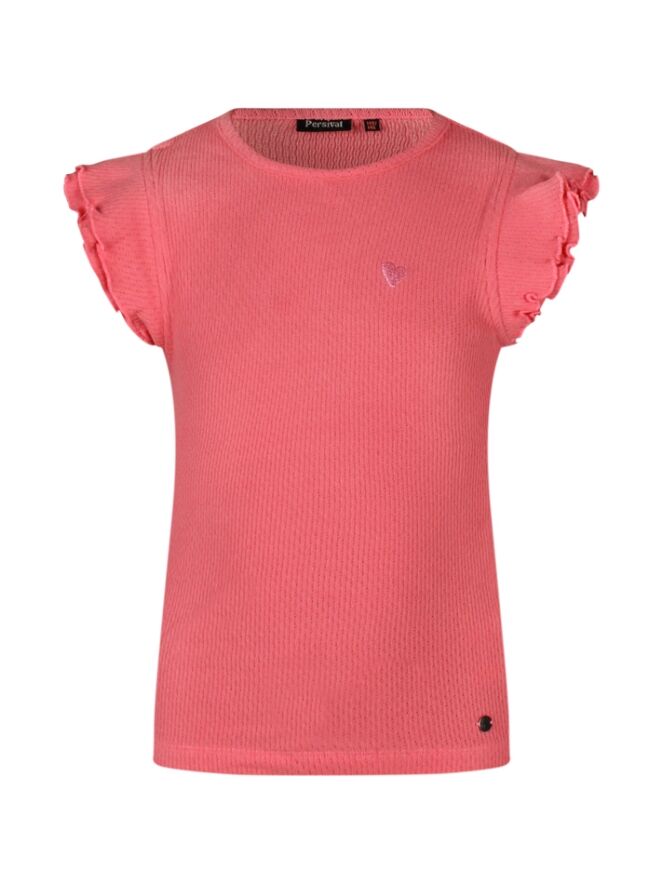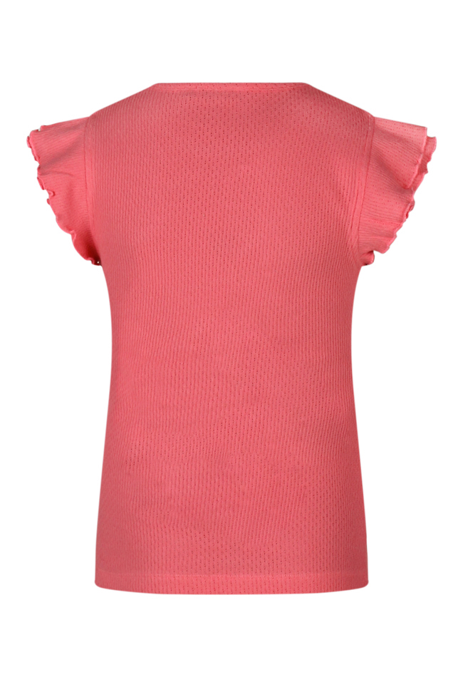 Dit meisjes singlet is gemaakt van een fijne brei ajour stof en heeft schattige ruches voor een speelse uitstraling. Het setje wordt compleet met een bijpassende short (Z90097), perfect voor warme zomerdagen.