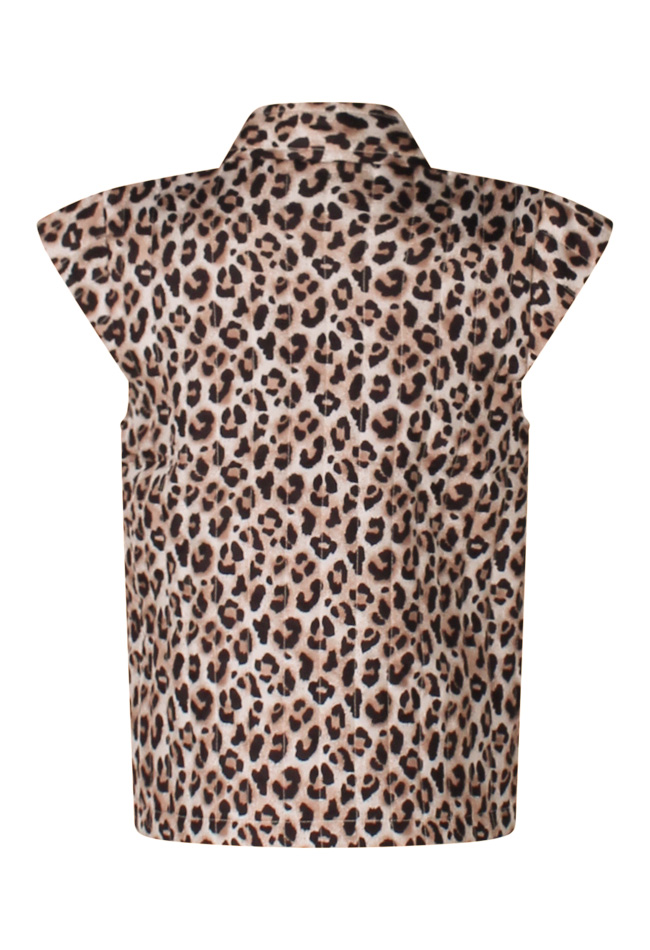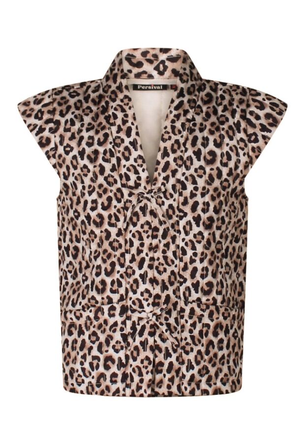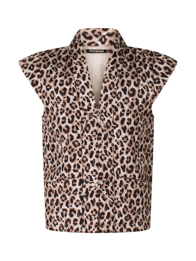 Leuk giletje als je helemaal gek van panterprint bent! Dit exemplaar sluit met een haak en oogje aan de voorkant maar het lijkt net of het gestrikt is. Leuk over een top of T-shirt!