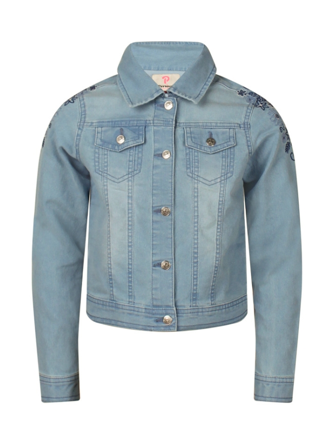 Trendy en tijdloos met dit leuke zomerse spijkerjasje in een frisse wassing met blauw bloemen borduursel op de schouder. Met drukknoopjes aan de voorkant. Twijfel over de maat? Check onze maattabellen!