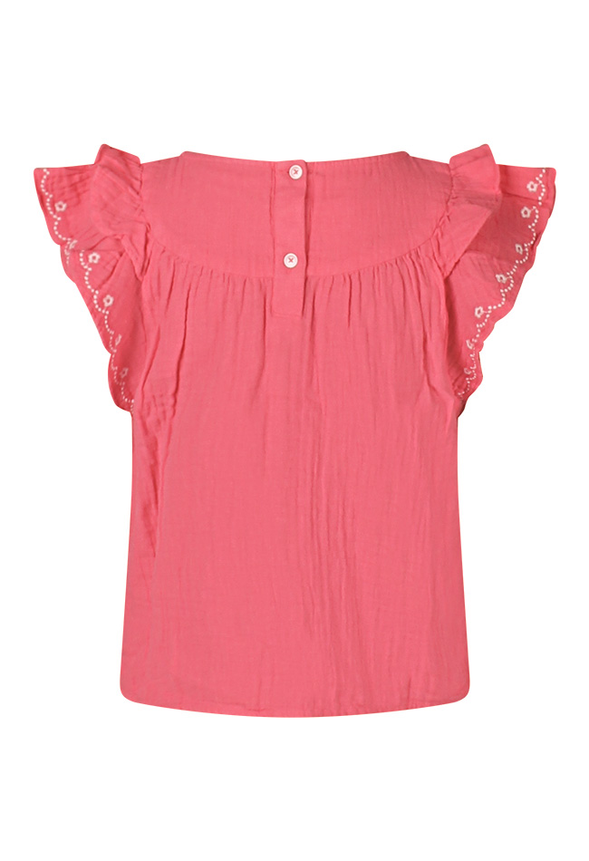 Zomers blikvangertje! Prachtige heerlijk dragende blouse voor meisjes van 100% mousseline katoen. Met fraaie borduring op de mooie kapmouw en rond de hals.