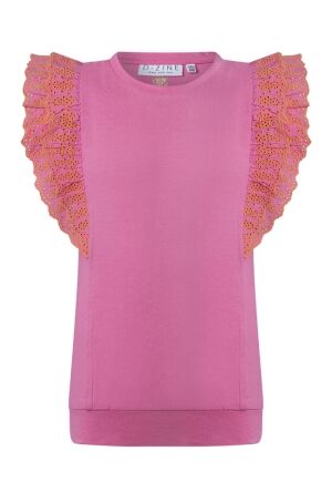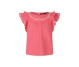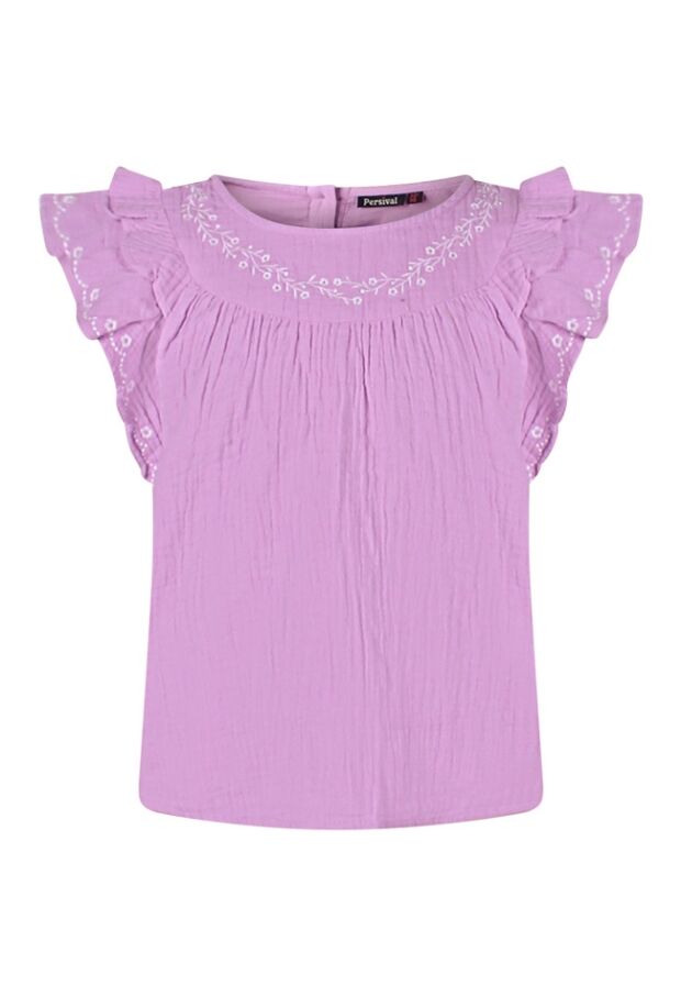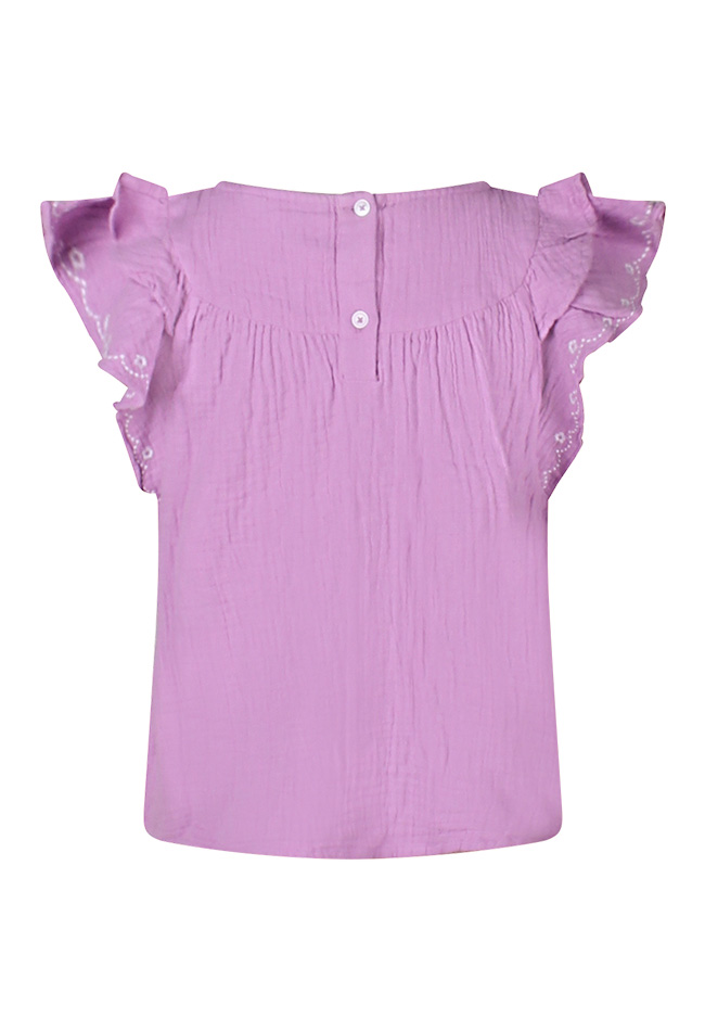 Zomers blikvangertje! Prachtige heerlijk dragende blouse voor meisjes van 100% mousseline katoen. Met fraaie borduring op de mooie kapmouw en rond de hals.