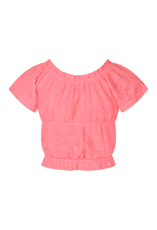 Dit zomerse shirt is een perfecte combinatie van speels en stijlvol! De ajourstof zorgt voor een luchtige uitstraling, terwijl de gesmockte details een mooie pasvorm geven. De korte mouwen en elegante boothals maken dit shirt ideaal voor warme dagen.