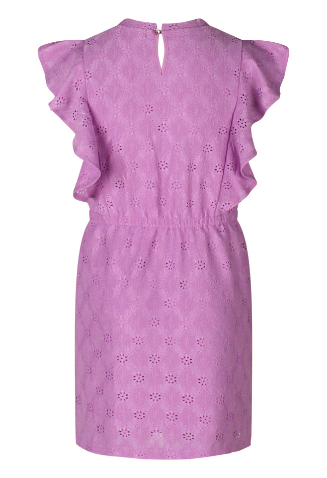 Deze mouwloze zomerjurk is een must-have voor zonnige dagen! De ajourstof en schattige ruches op de schouders geven een speelse en lieve uitstraling.
