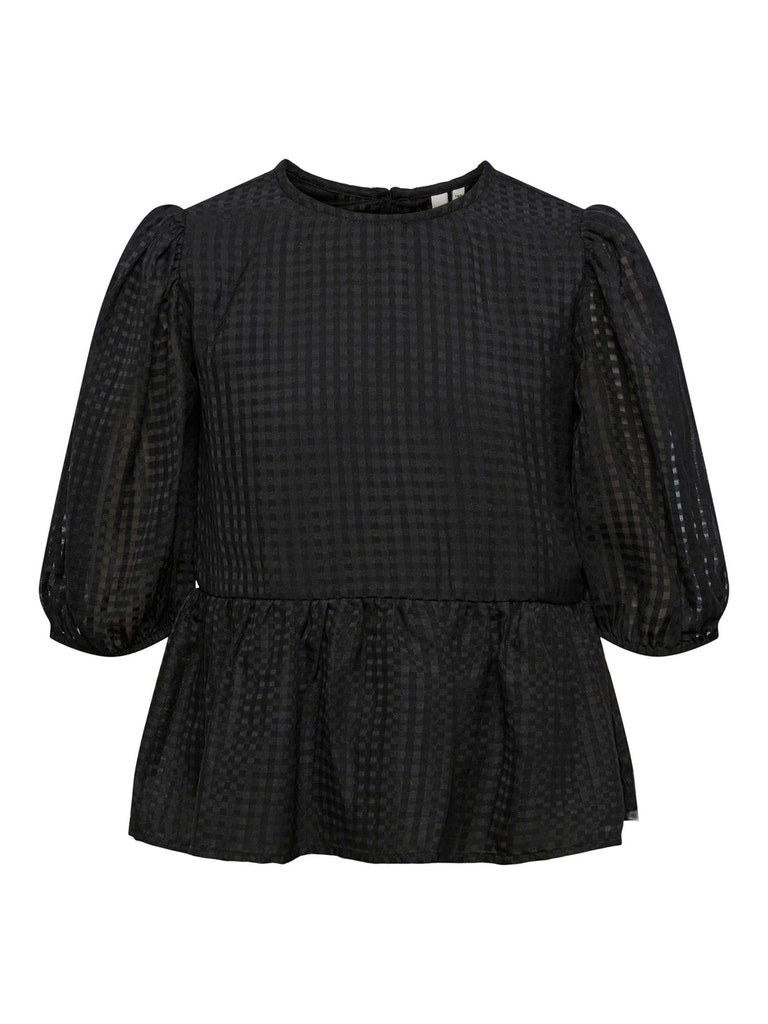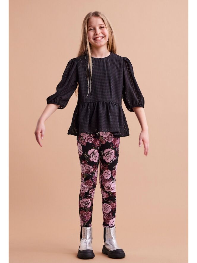 Top van Little Pieces. De top heeft pofmouwen en een uitlopende onderkant. De bovenlaag is van geruite mesh stof. Valt ruim, dit hoort zo. Materiaal: 100% polyester waarvan 60% recycled. Wassen op 30 graden, niet bleken, niet in de droger, niet strijken.