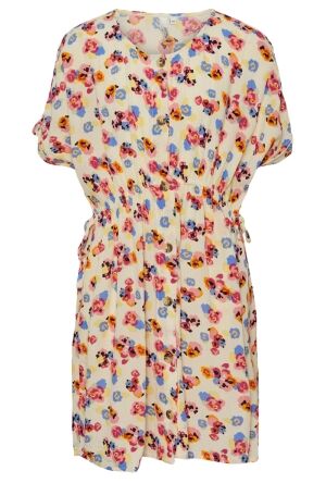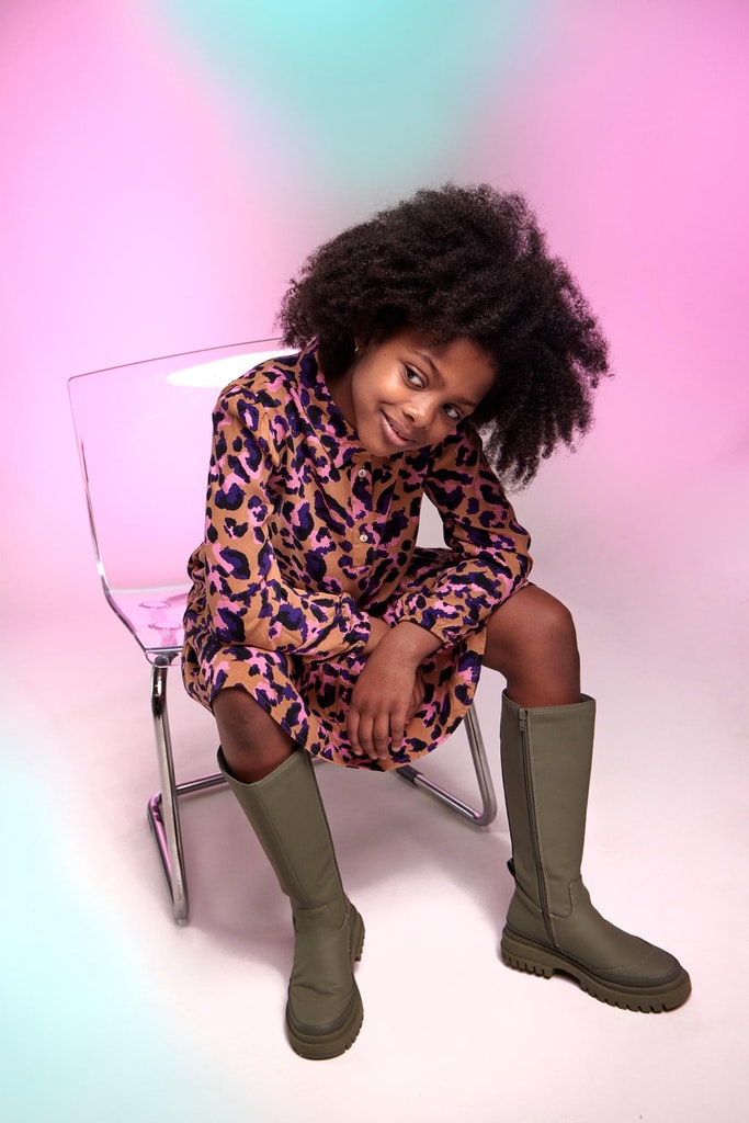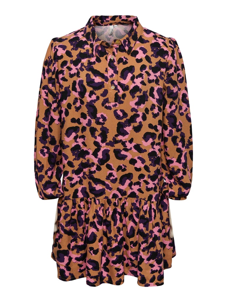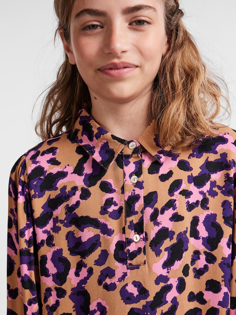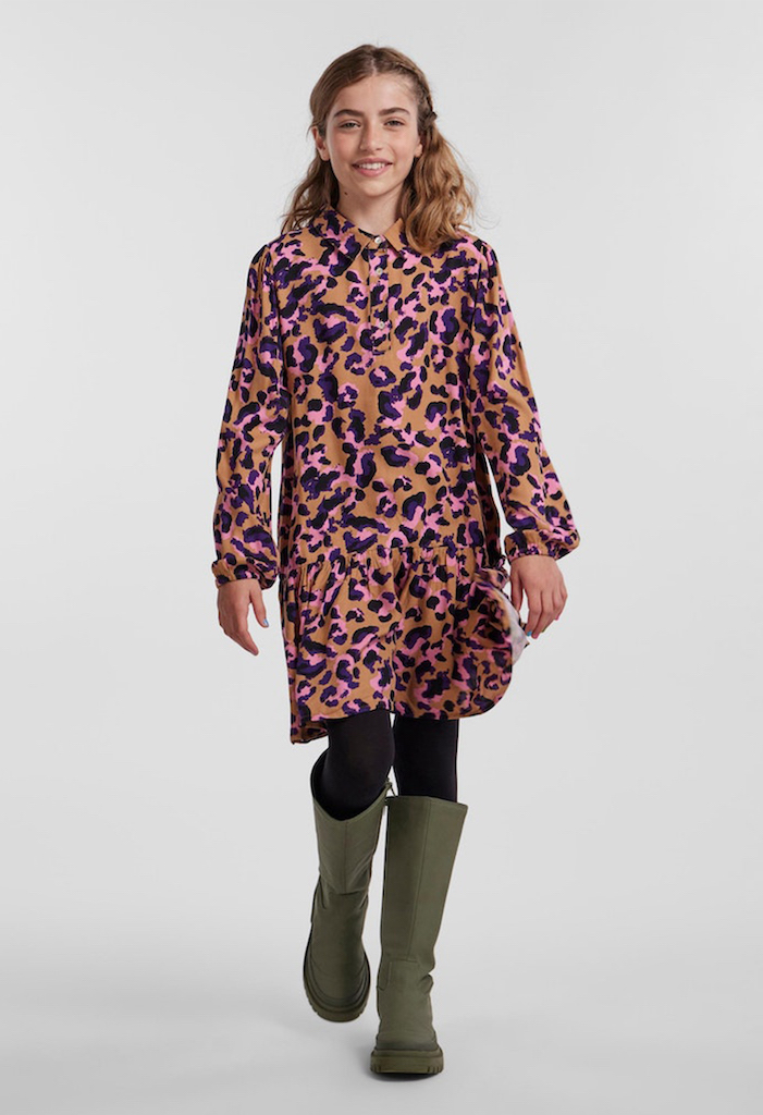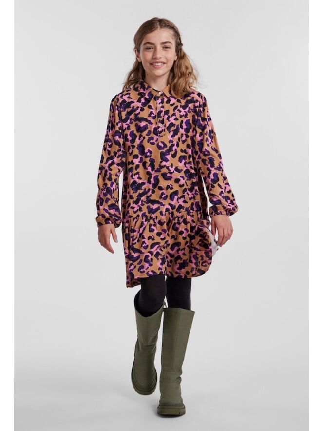 Jurk met all over print van Little Pieces. Deze jurk valt net boven de knie, heeft een normale kraag en word bovenaan gesloten met drie knopen. De jurk heeft een pofmouw en onder bij de pols zit een elastiek. De print is een panter print met een bruine ondergrond en paars, roos en zwarte pantervlekken. Draag deze jurk met een dikke maillot of legging en stoere boots.