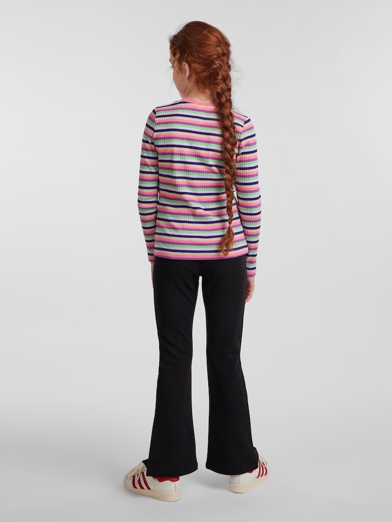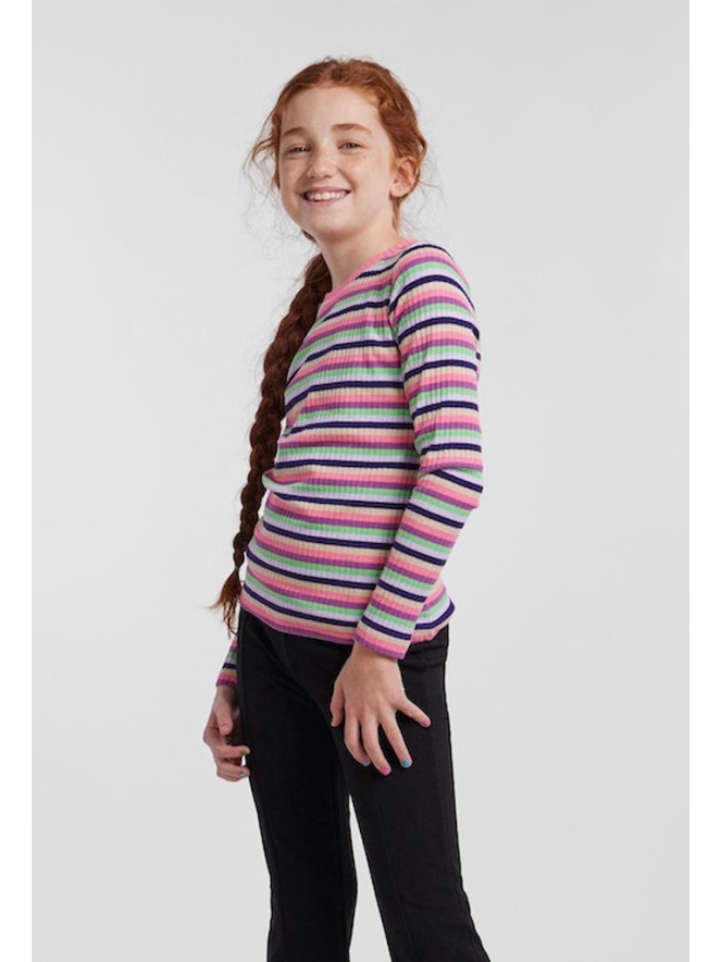 Gebreide rib top van Little Pieces. Deze top heeft een aansluitende pasvorm met lekker veel stretch, een ronde neklijn en lange aangesloten mouwen. Op de top zit een streep motief in de breedte in verschillende kleuren.