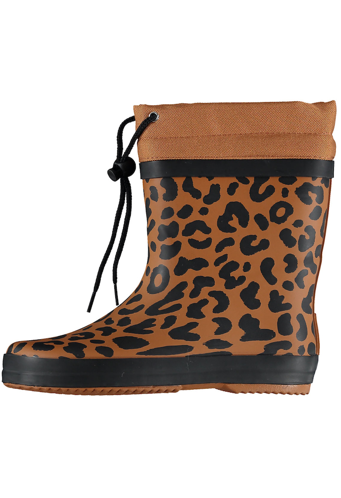 Regenlaarsjes van XQ Footwear. De laarsjes hebben een panter print. Op de bovenkant zit een stoffen stuk met een aantrek koordje.