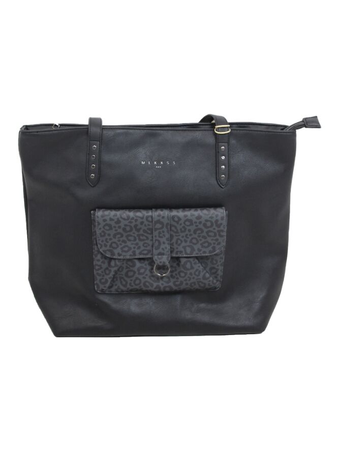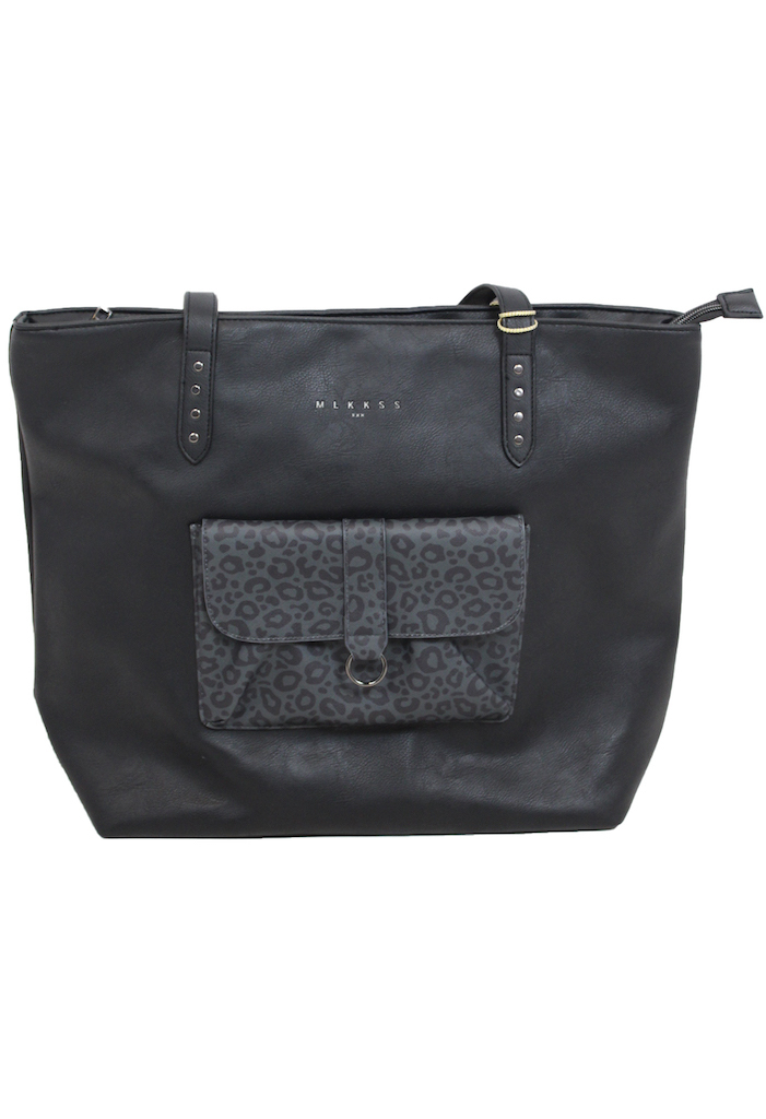 Handtas van Milky Kiss Soulmate. Kan als schoudertas en als handtas gedragen worden. De tas heeft een ritssluiting. Op de voorkant zit een voorvakje in een panter print.