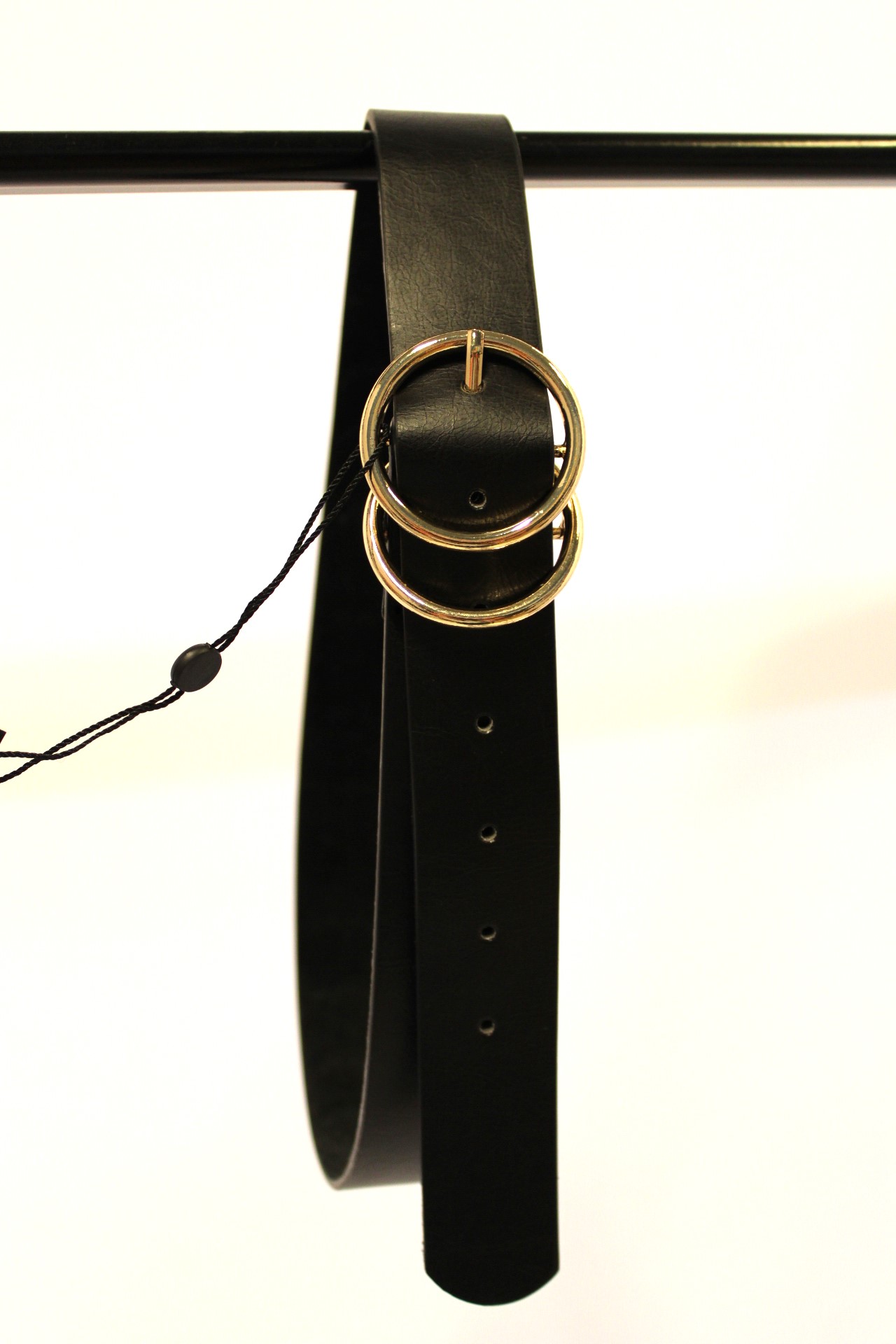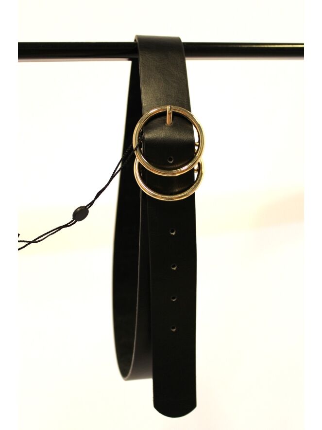 Zwarte riem met een goud of zilver kleurig gesp. De riem is 3,4 cm breed.