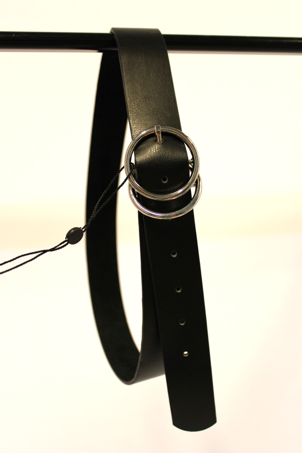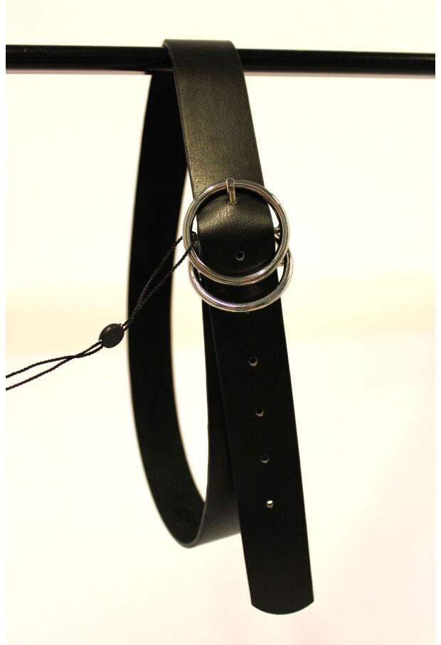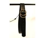 Zwarte riem met een goud of zilver kleurig gesp. De riem is 3,4 cm breed.