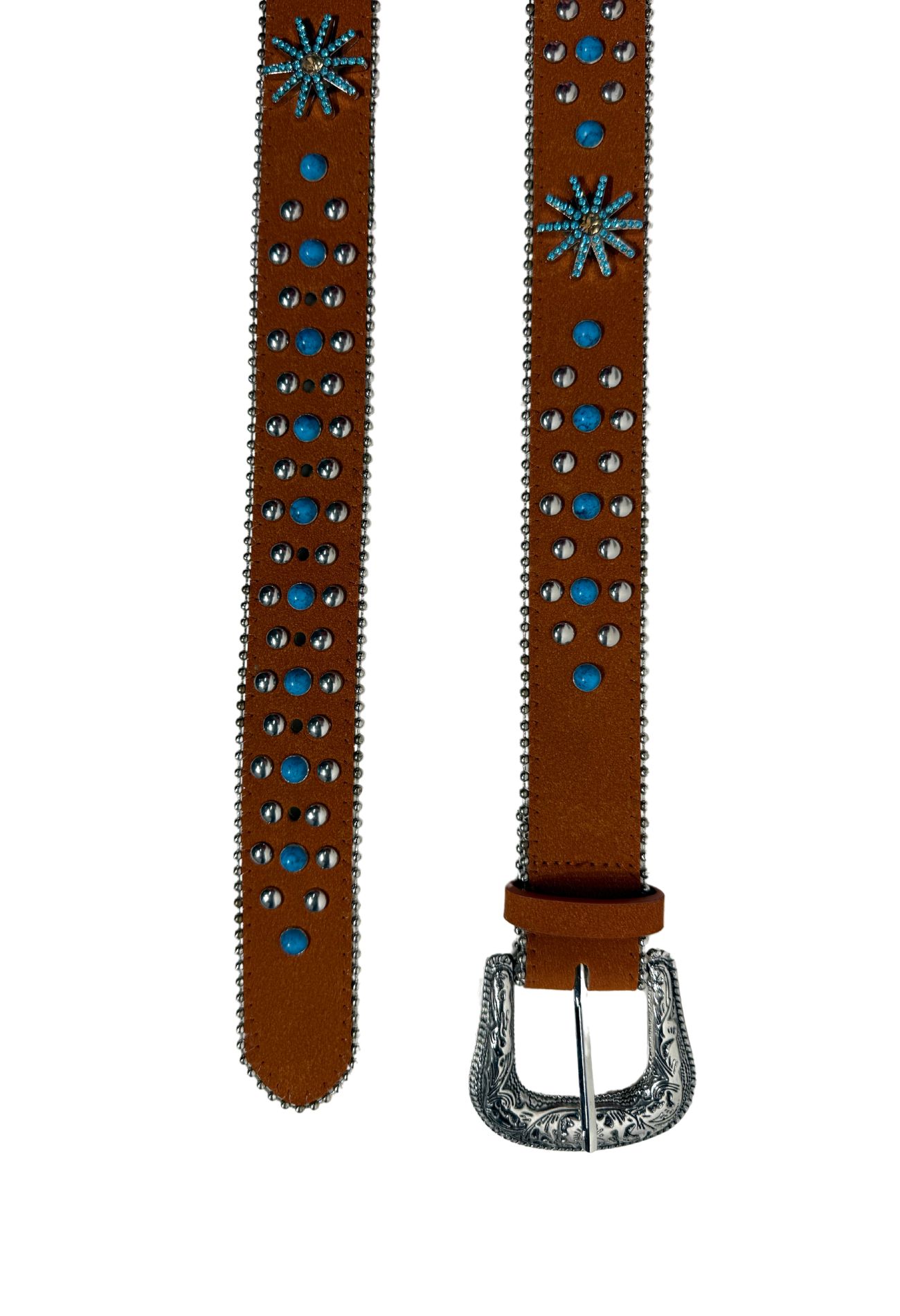 Deze leuke cognac gekleurde riem zit vol met studs en aqua steentjes. Het gespwerk is zilver gekleurd. Hou jij van Bohemian style? Dan is deze riem perfect voor jou!