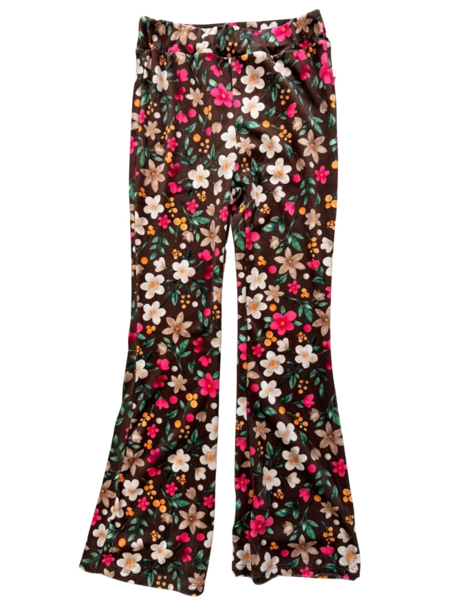 Super zachte velvet flair broek voor meisjes met vrolijke bloemenprint. Combineer deze lange broek met stoere boots en een effen shirt met giletje en je bent super trendy en hip!