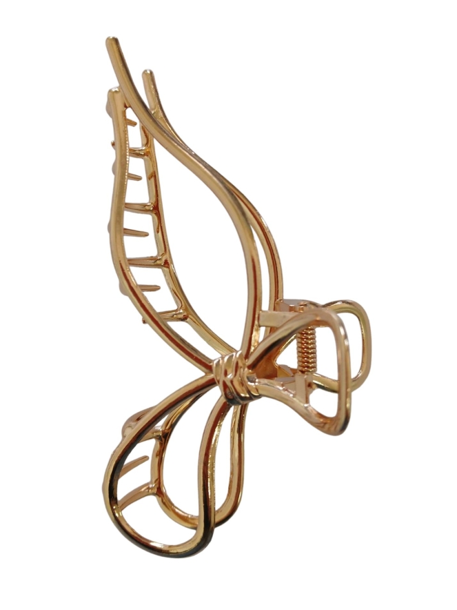Degelijke haarclip in de kleur goud, zilver of gun grijs. De strik haarklem heeft een lengte van 13 cm.