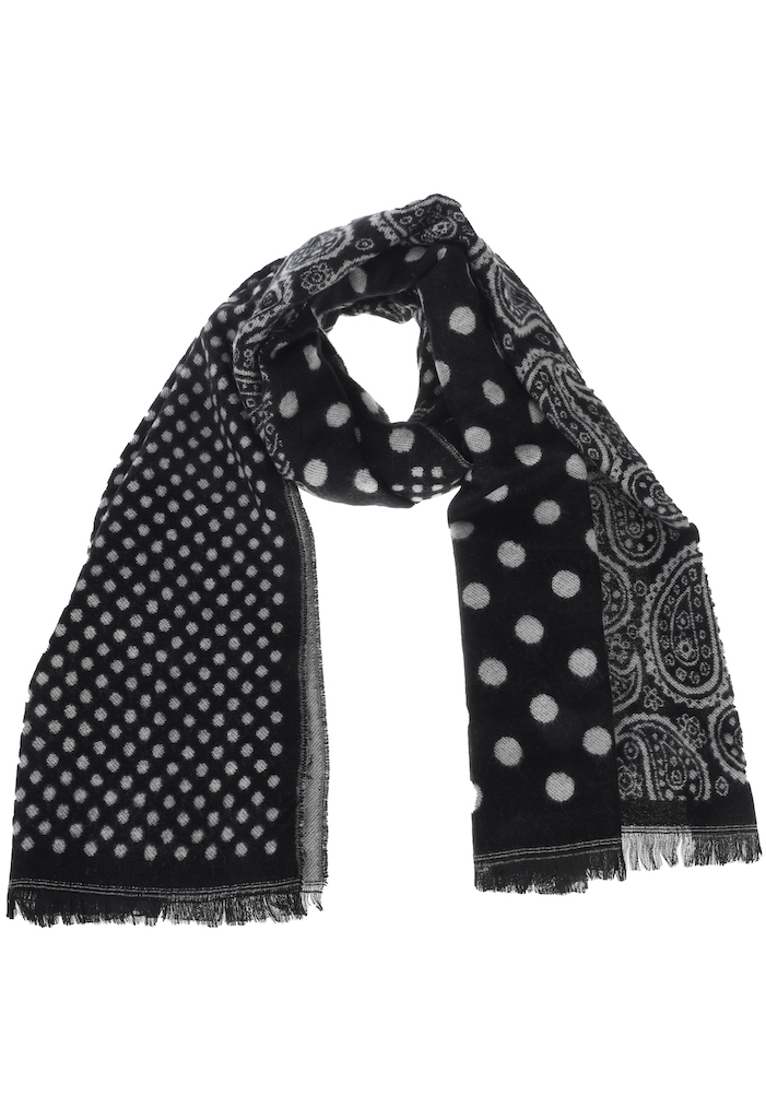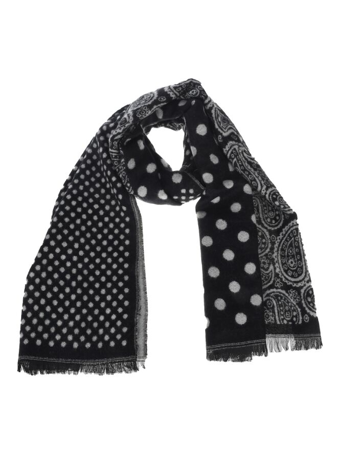 Deze sjaal heeft een stippen en paisley design. Afmeting: 65 x 190 cm.