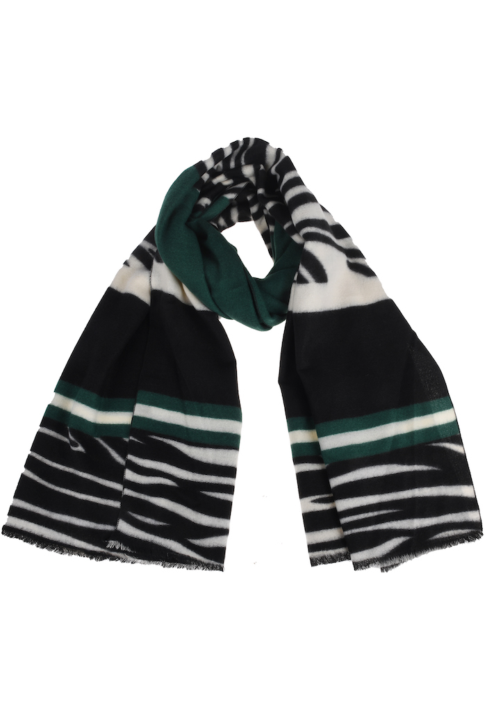 Deze sjaal heeft een mix van zebra en een effen print. Afmeting: 85 x 190 cm.