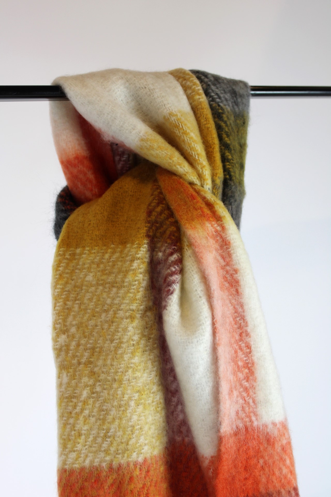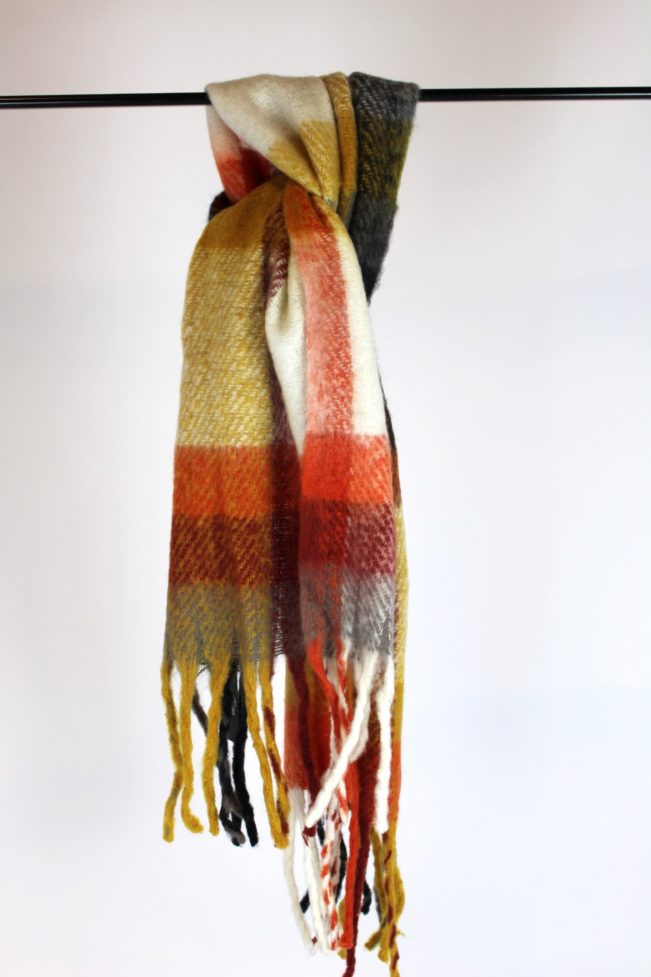 Deze geruite sjaal heeft een blokpatoon met een afmeting van 50 x 190 cm.