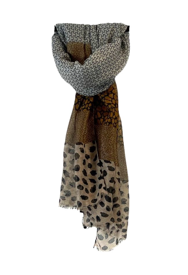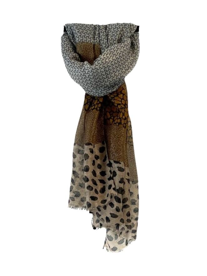 Deze sjaal met diverse patronen bevat een zilveren lurex draad. De afmeting is 85 x 180 cm.