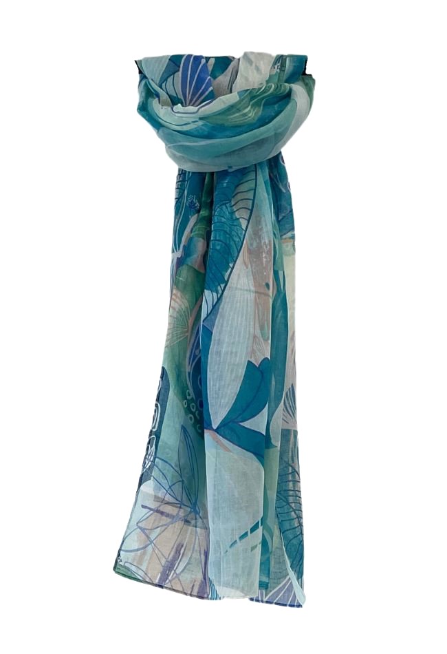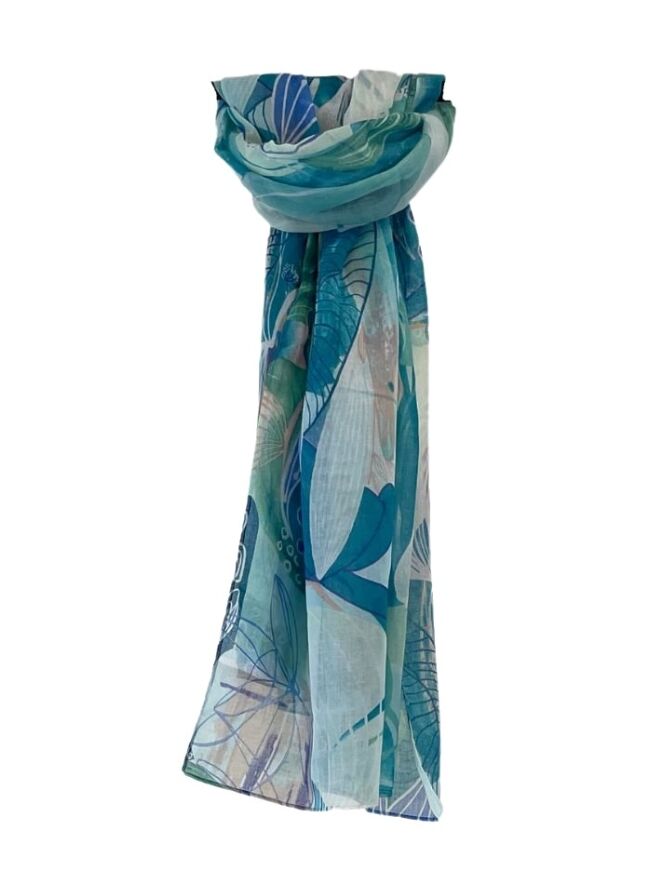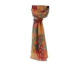 Deze kleurige sjaal heeft een vullend blader patroon met een afmeting van 90 x 180 cm.