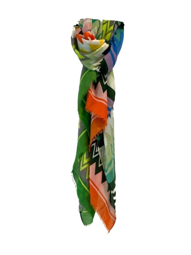 Deze sjaal met gekleurde zigzag print heeft een afmeting van 90 x 180 cm.