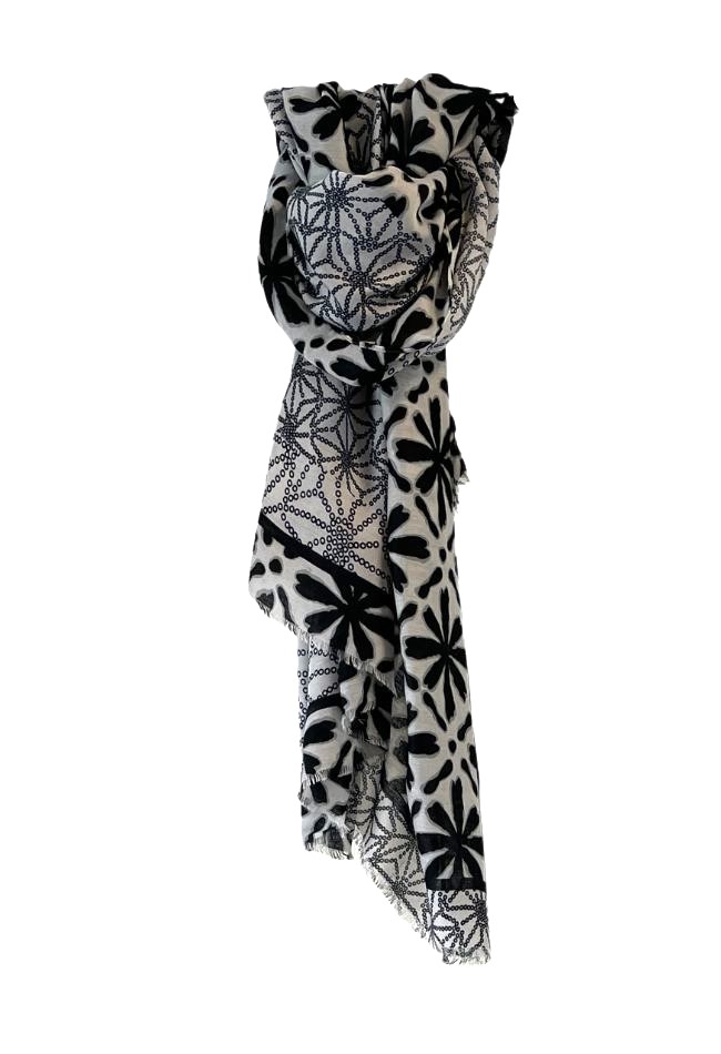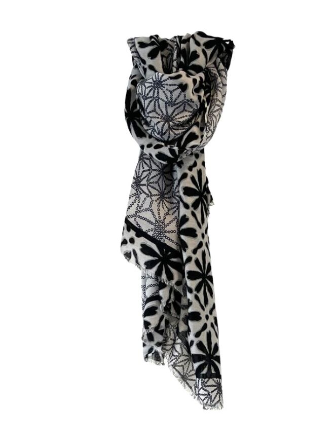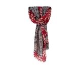 Deze sjaal met batik print heeft een afmeting van 90 x 180 cm.
