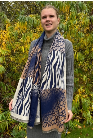Sjaal met blokpatroon, gemaakt van een stof met ribstructuur en afgewerkt met speelse franjes.