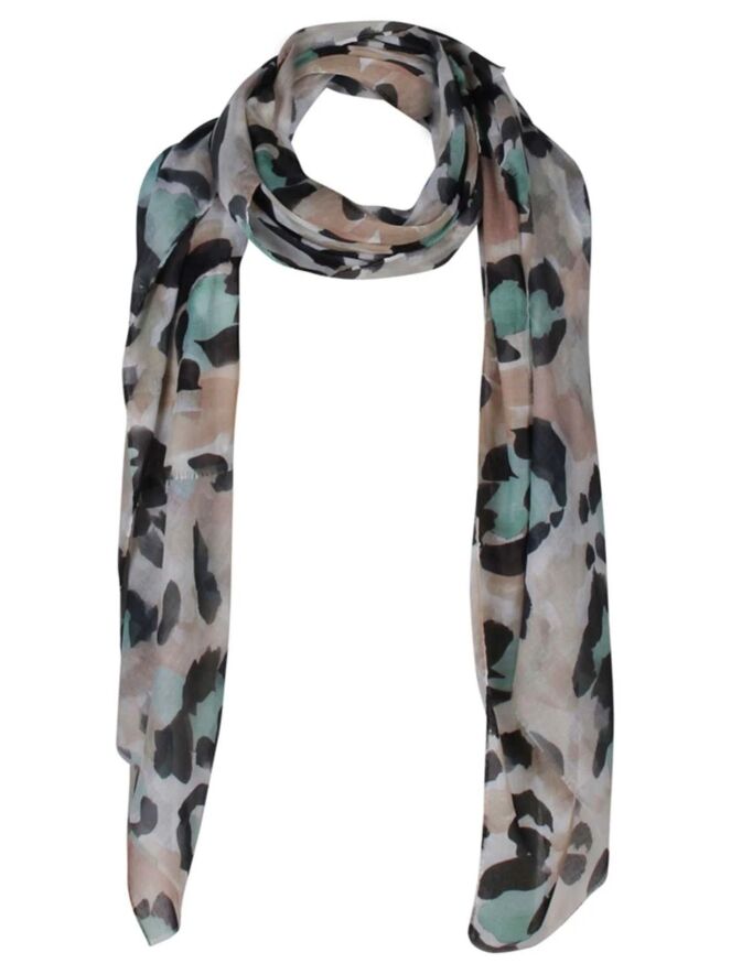 Deze mooie dunne sjaal heeft een grote panterprint. Hij is van 100% polyester met een afmeting van 90 x 180 cm.