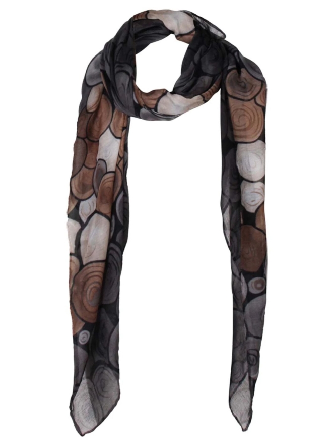 Deze sjaal met stenenprint heeft een variatie in kleuren. De afmetingen zijn 85 x 180 cm.